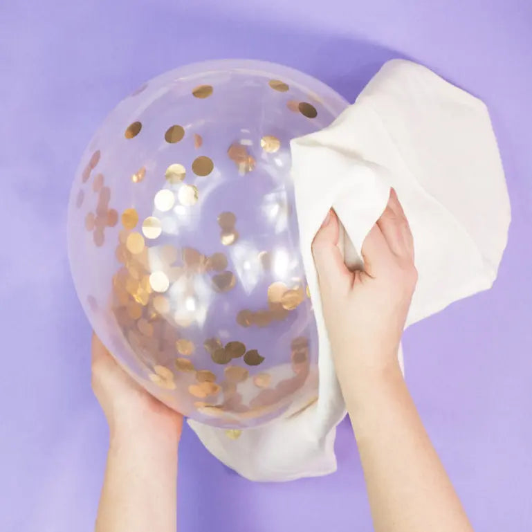 You’ll need to create static energy by rubbing the balloon on any item of clothing, preferably a scarf or wool jumper. Then, roll the balloon around for ultimate confetti dispersing. VoilÃ