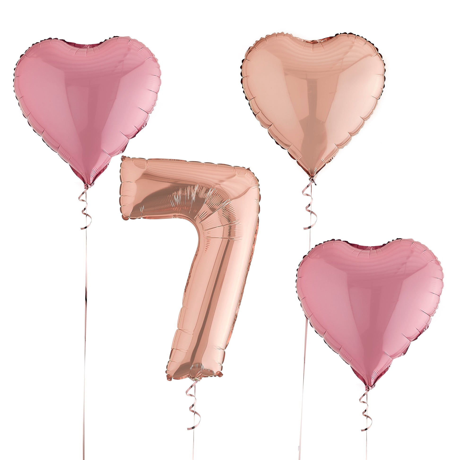 Each number balloon and the balloon bouquet is tied securely on to rose gold weights, at various heights.