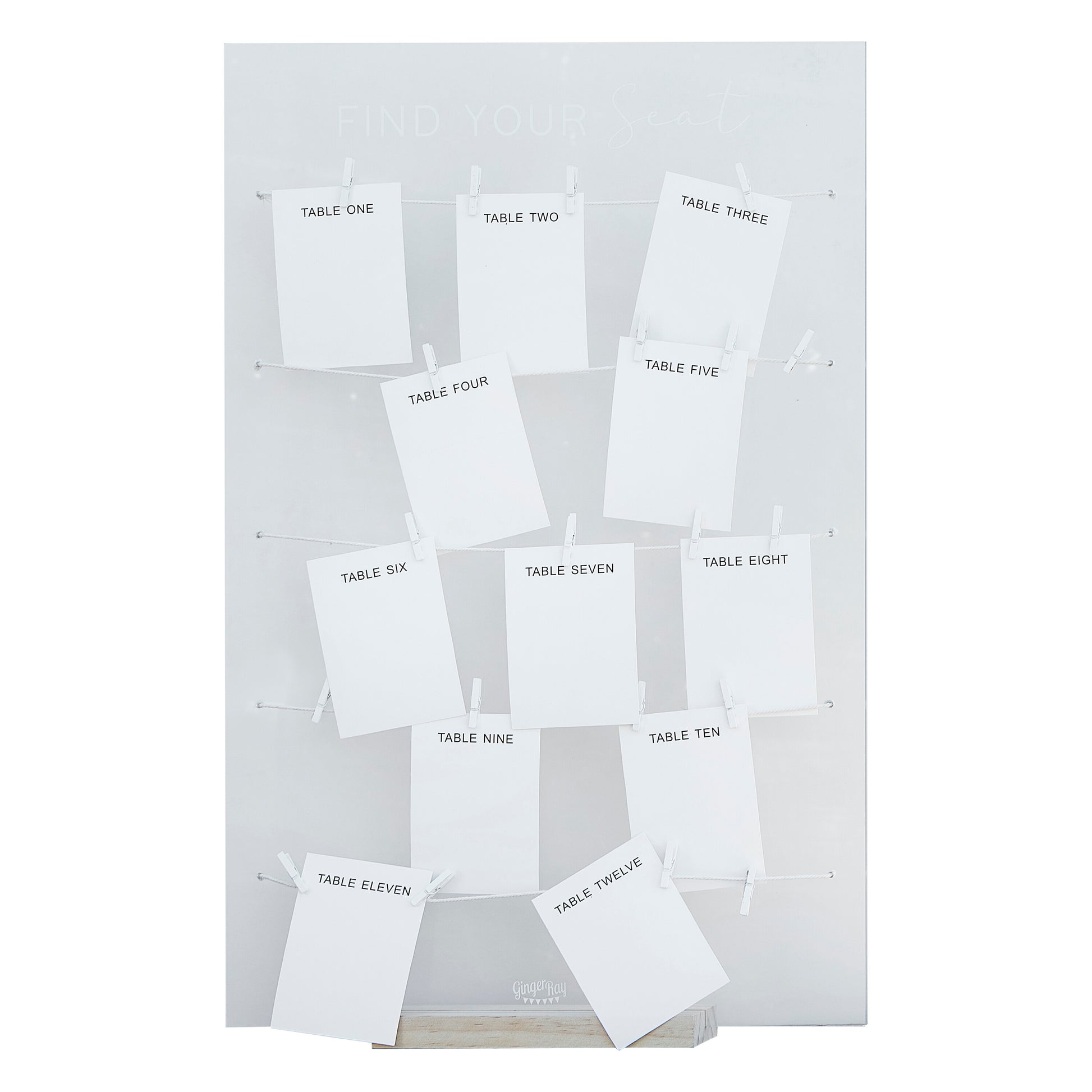 This is the perfect way to display your table plan at your celebration, whether it be an engagement or anniversary celebration to a party reception. This acrylic table plan kit comes with a wooden stand with 'Find Your Seat' text, and then is completed with table number cards and white twine.