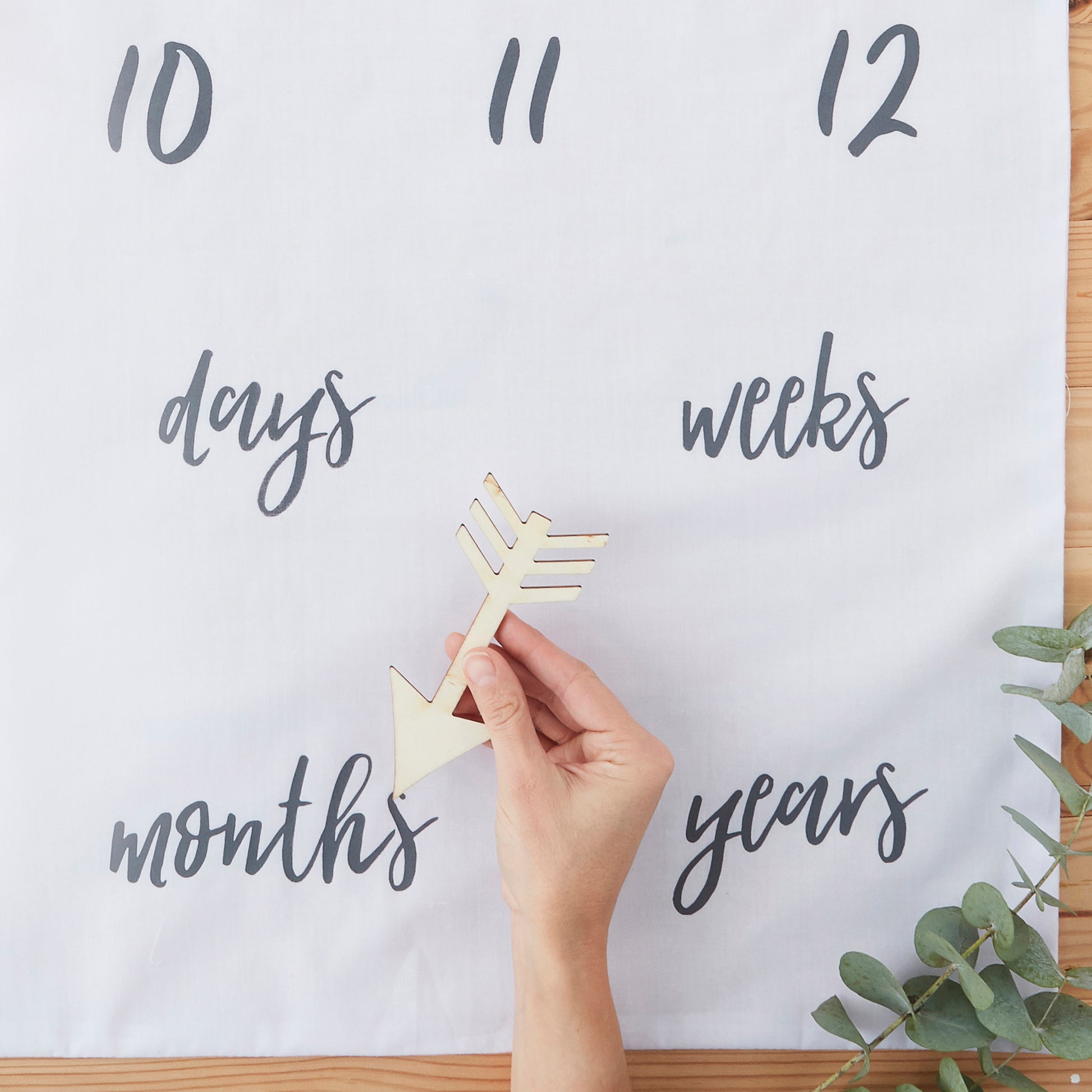 Lay the stylish white mat on the floor and use the wooden circle and arrow to point to the scripted numbers and day, week, month or year to forever remember important dates of your baby. Our Oh Baby guestbook doubles as the perfect baby photo album to store all of your milestone memories!
