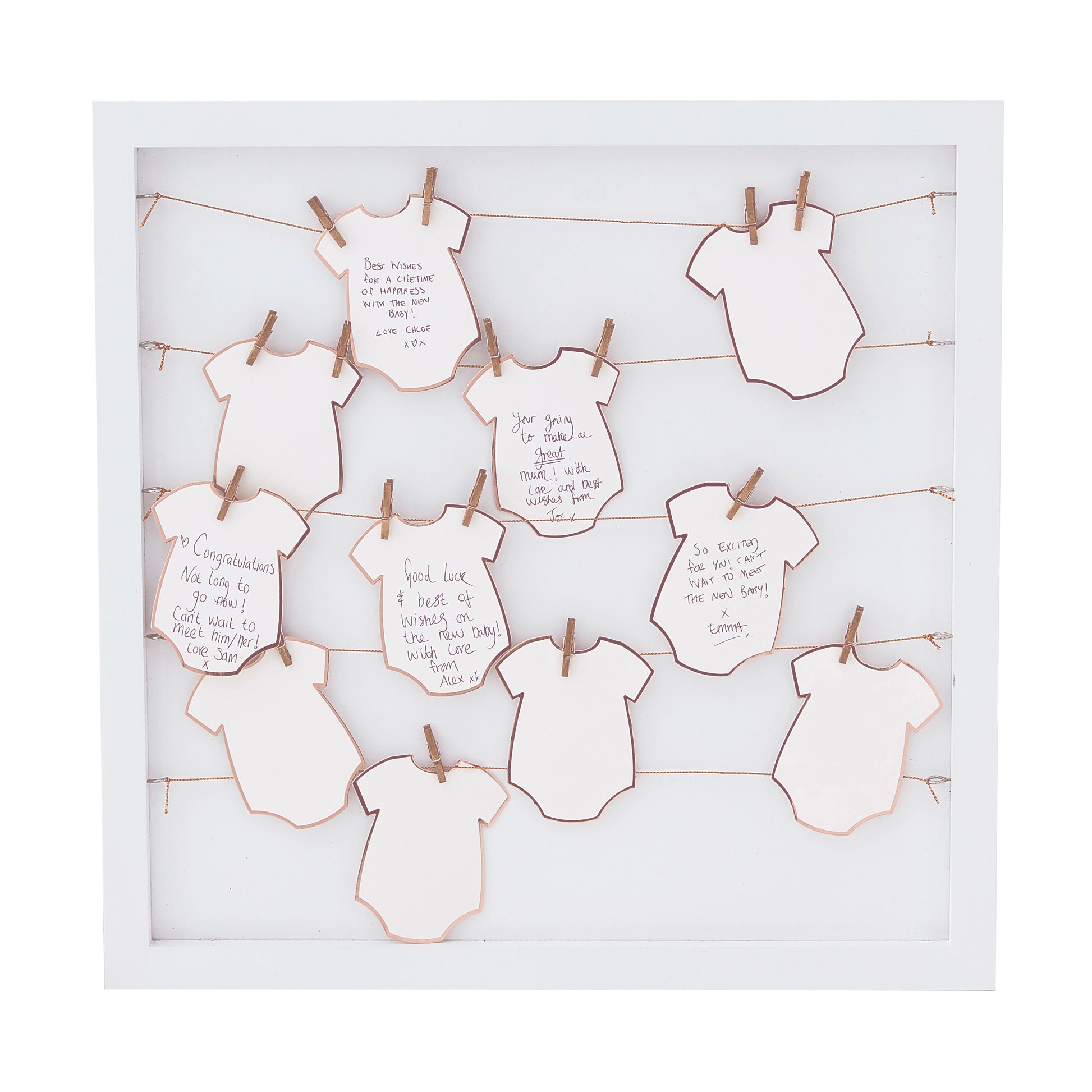 Fill the frame with messages and photographs from the special day to create a baby shower memory board to cherish. The frame guest book comes with 24 mini baby grows so your guests can fill out and add well wishes to the parents to be!