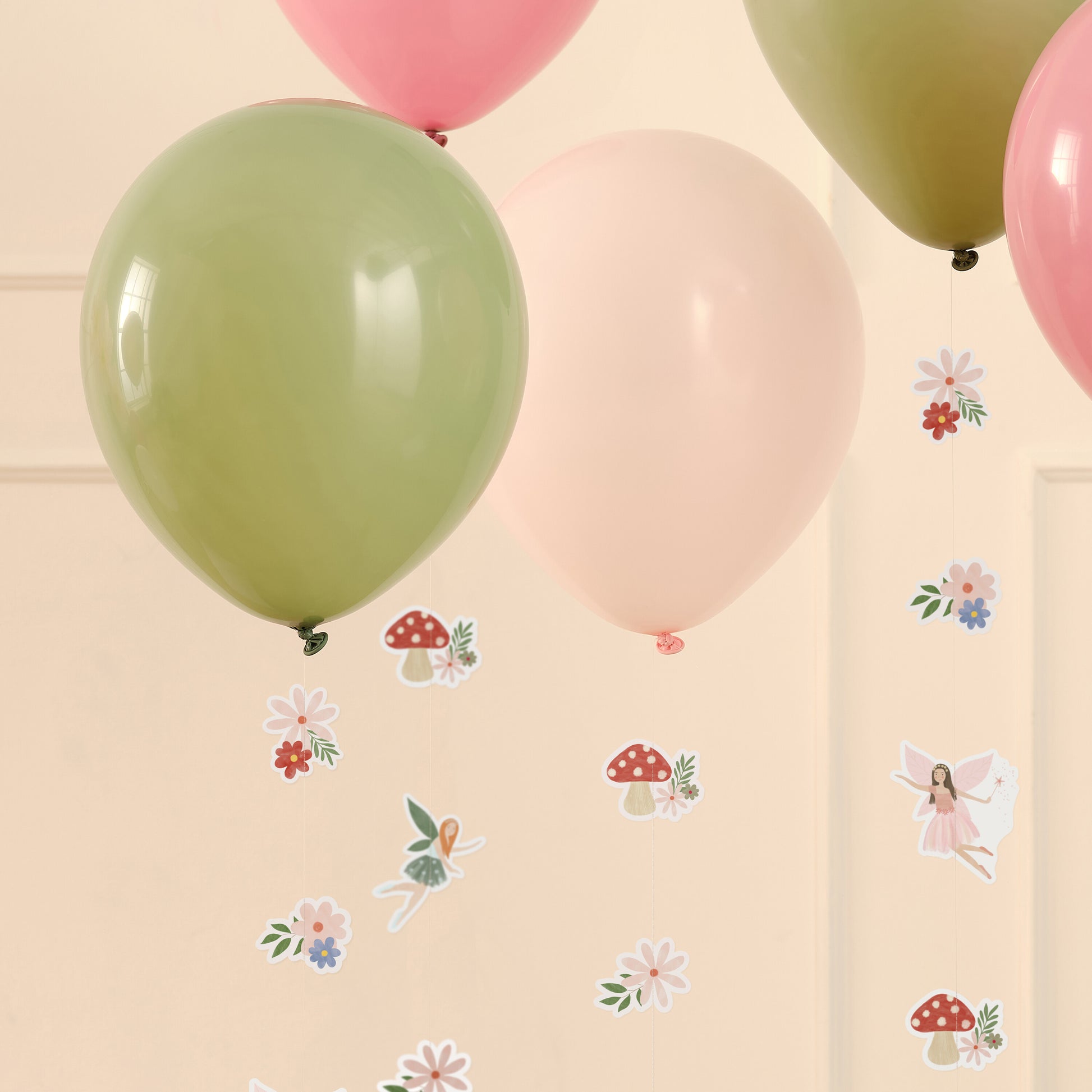 5 x 12 inch latex balloons in pinks and sage green with illustrated fairy balloon tails.