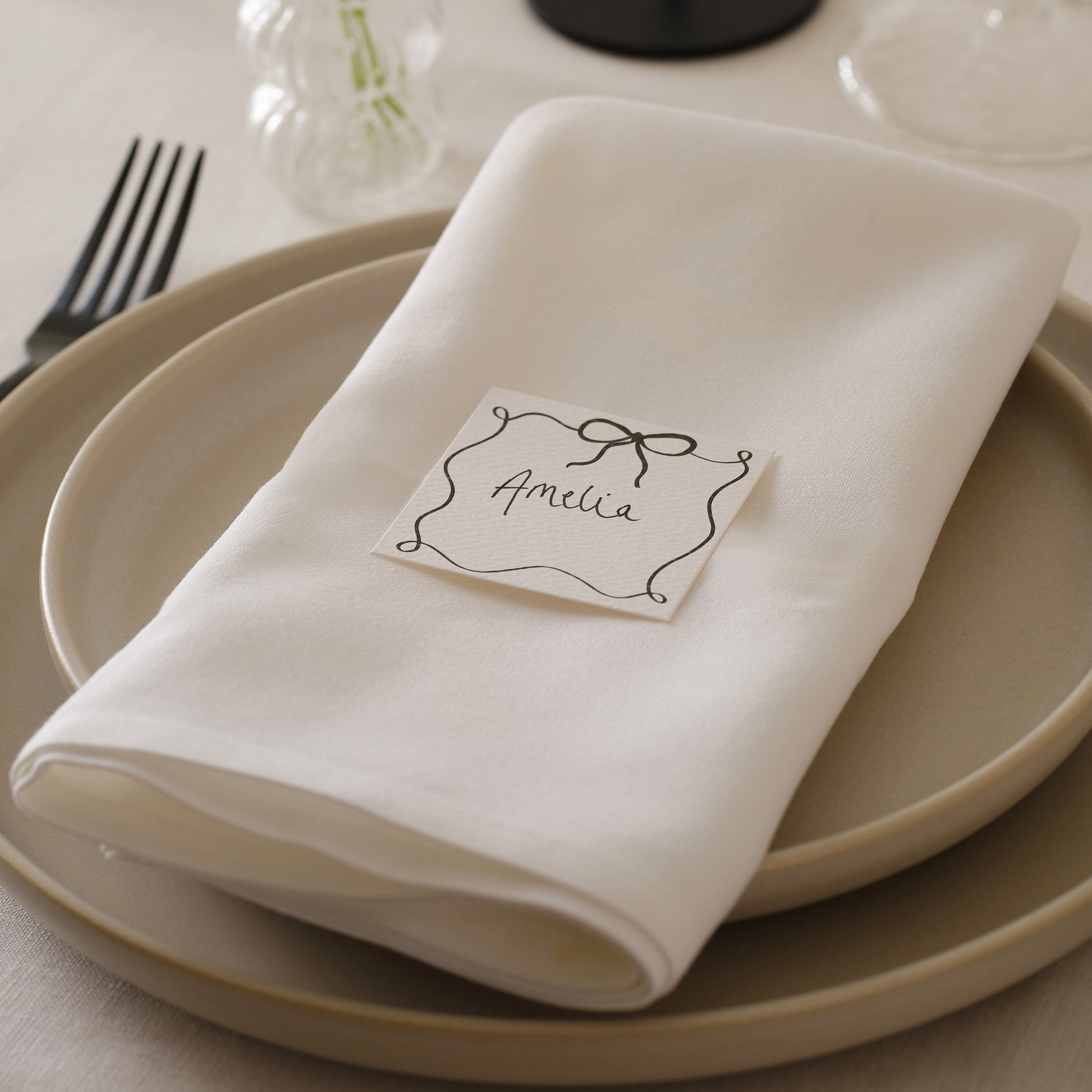 Set a refined and stylish tone for your wedding with these white textured place cards, each adorned with a delicate hand drawn black bow. Perfect for guiding your guests to their seats, these elegant cards add a personal and sophisticated touch to your tablescape.