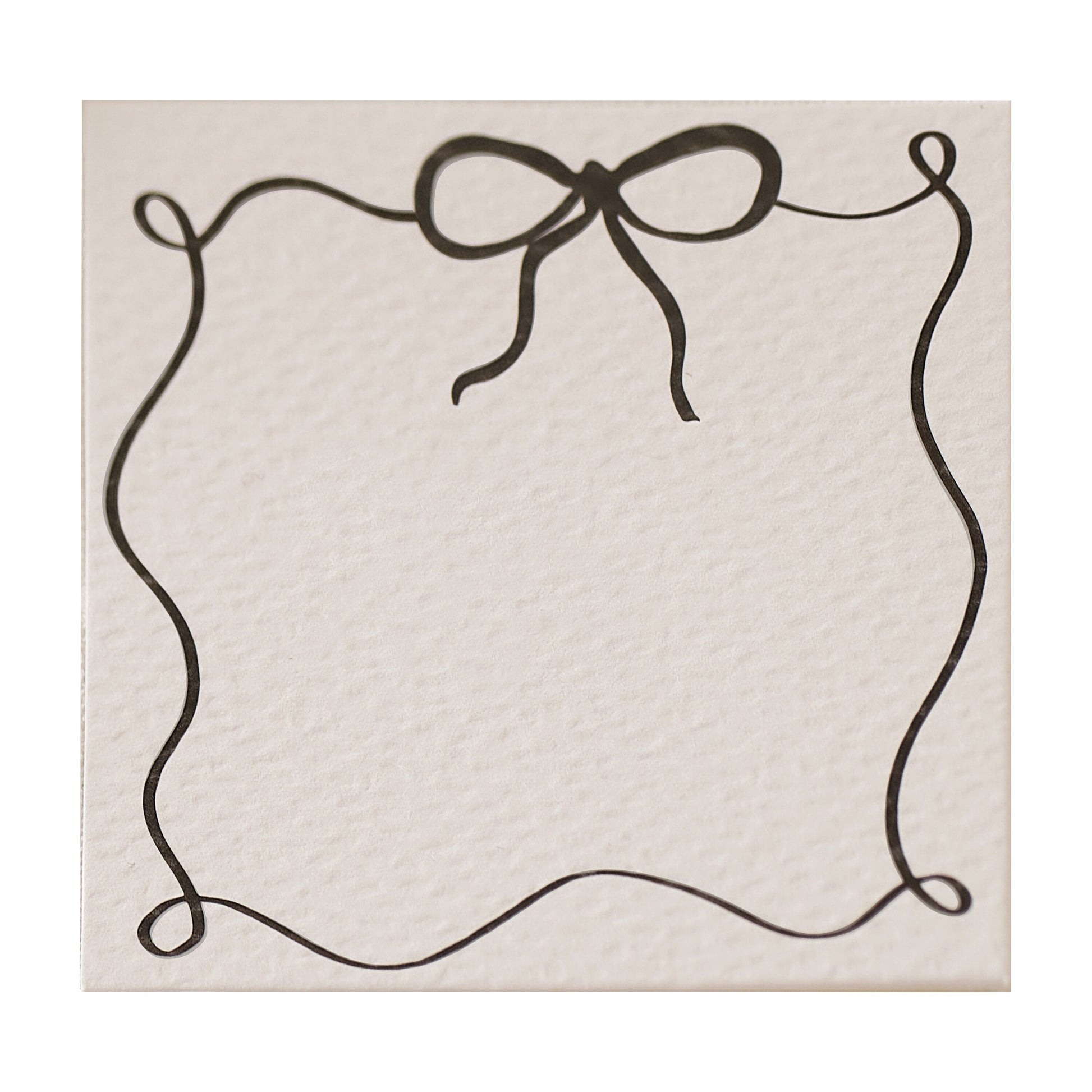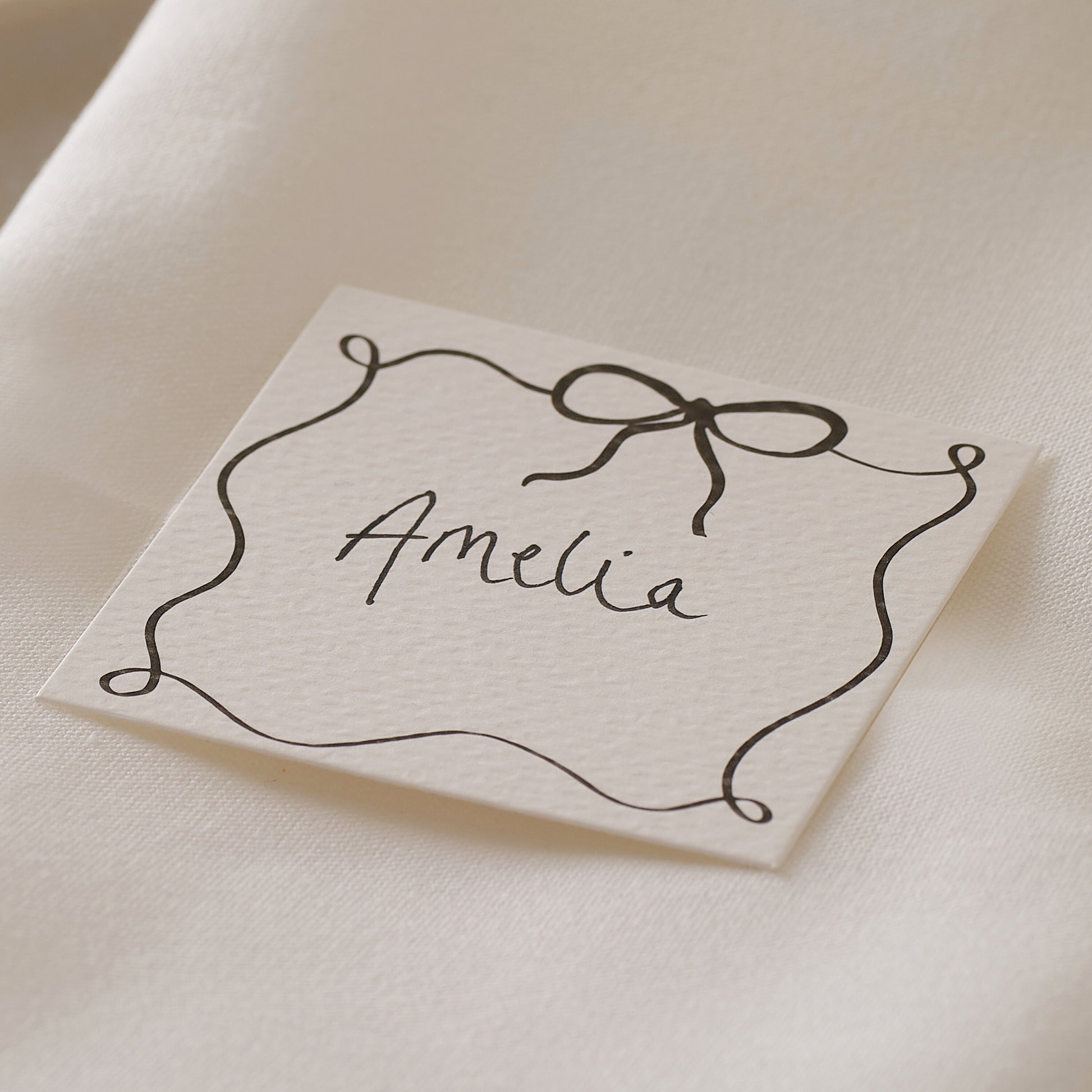 10 x white textured place cards with hand drawn black bows at 6cm H x 6cm W