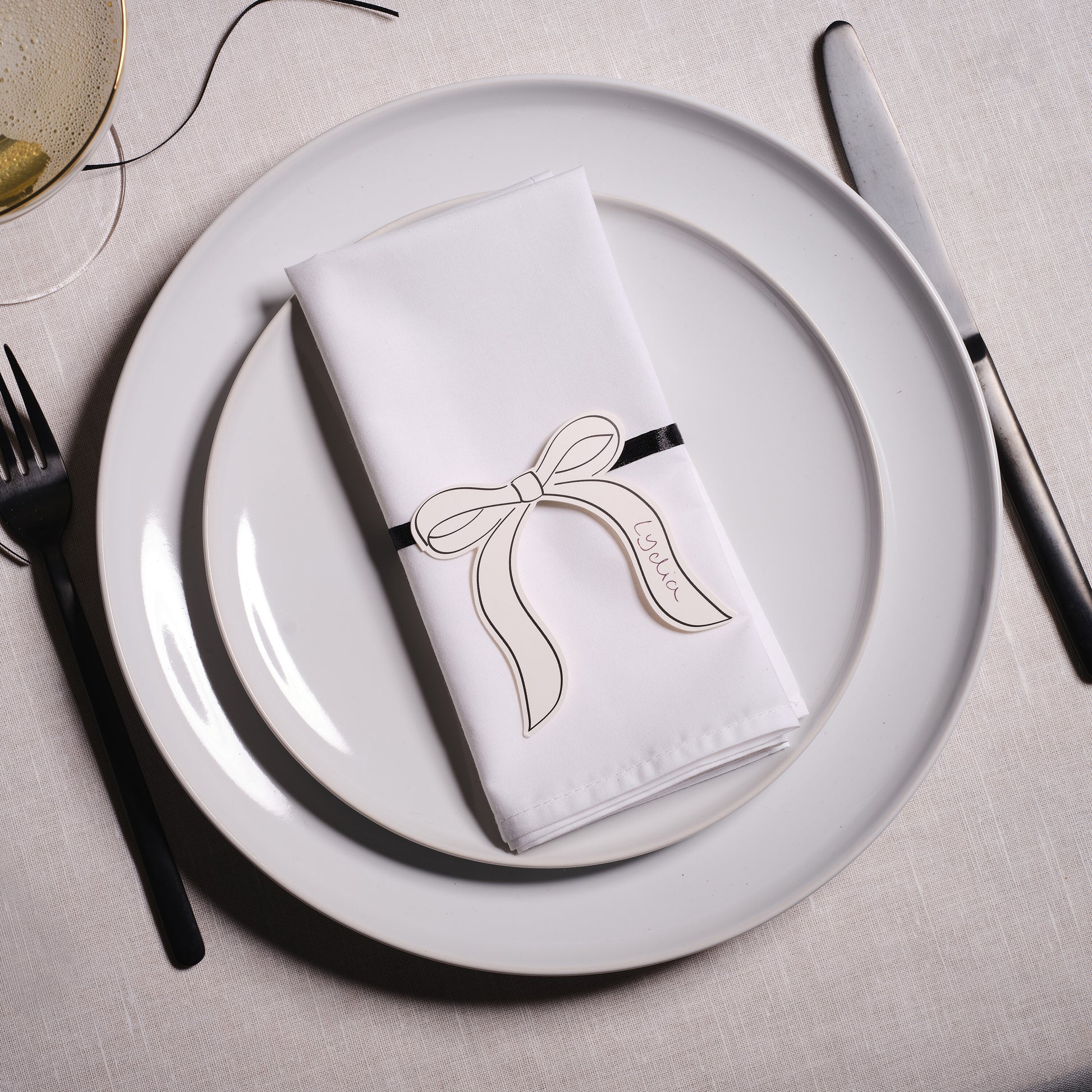 Add a personal touch to your table with these cream bow shaped place cards featuring a sleek black hand-drawn design they are perfect for any occasion.