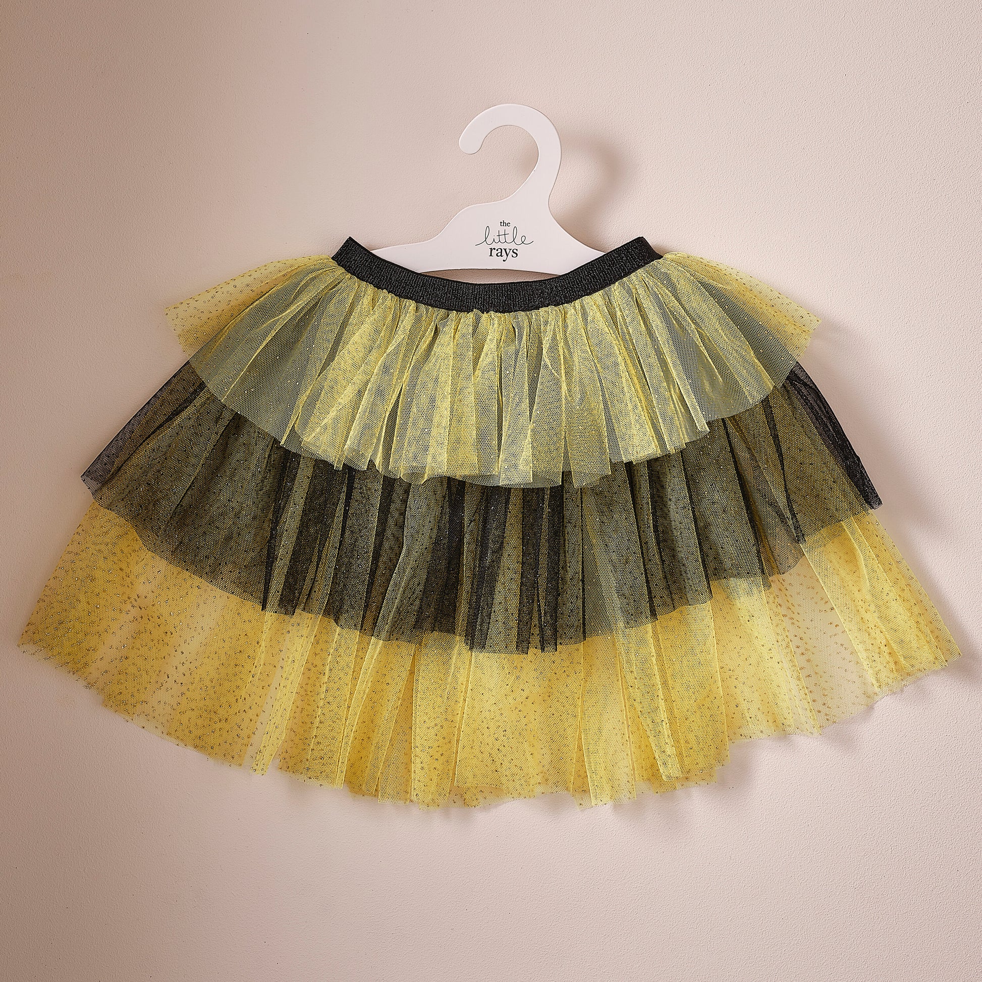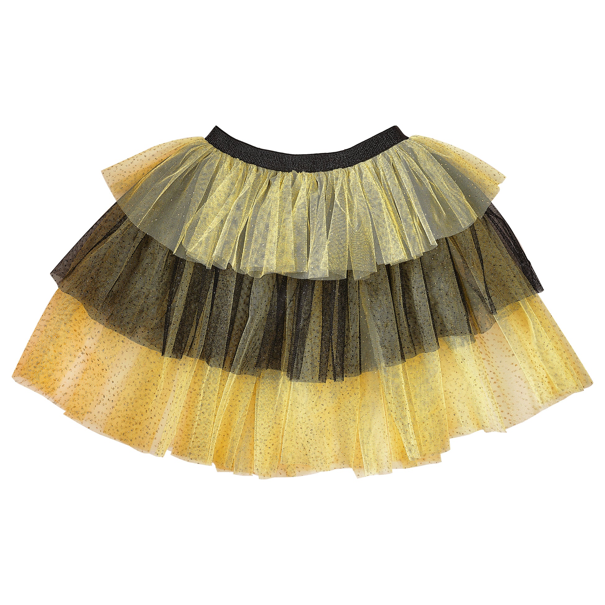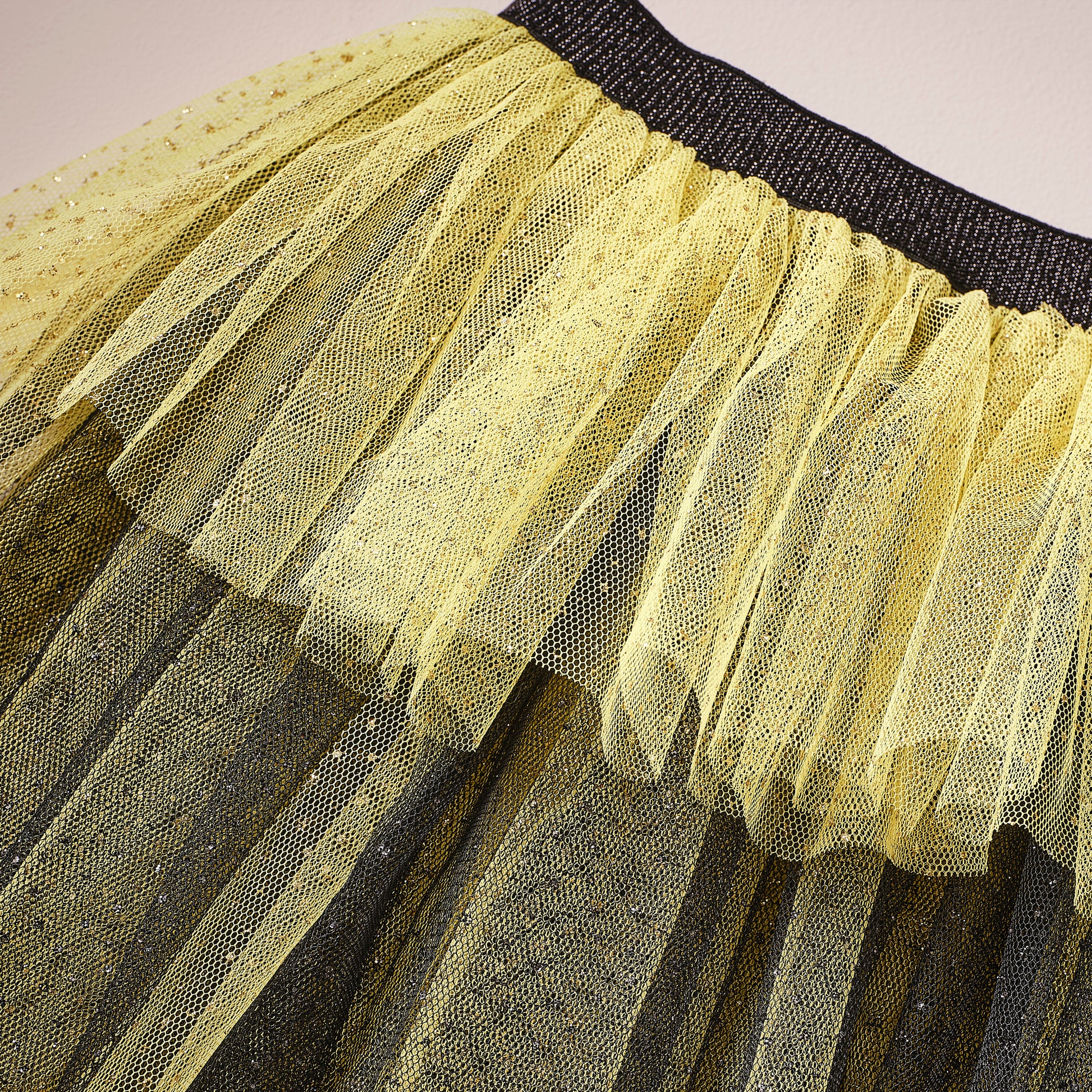 This tutu is made from yellow and black tulle, with silver flecks throughout.
