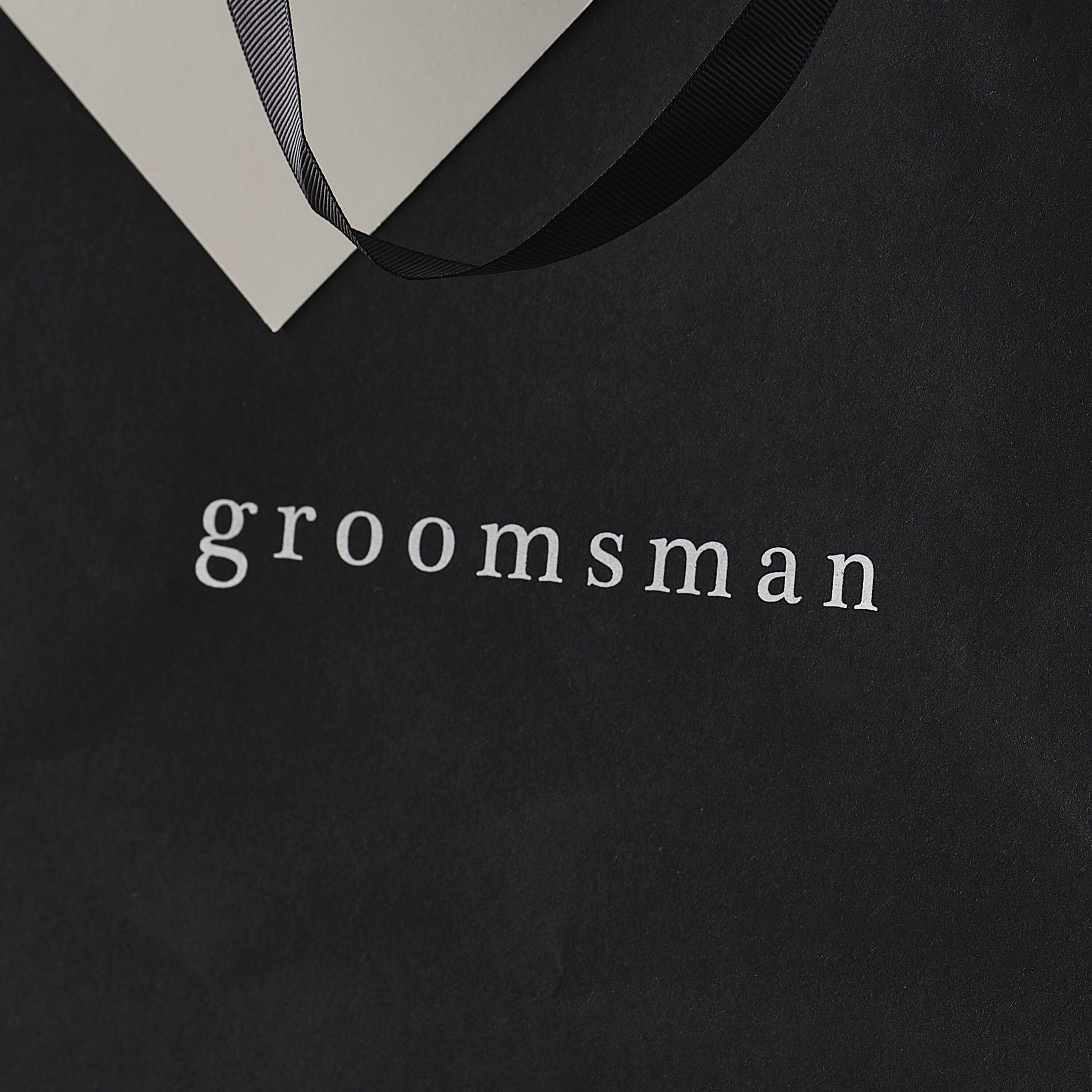 Make your groomsmen feel extra special with our matte black gift bag, featuring "Groomsman" in crisp white text. Sleek and stylish, this bag is the perfect way to present gifts or surprises to your closest friends on your big day.