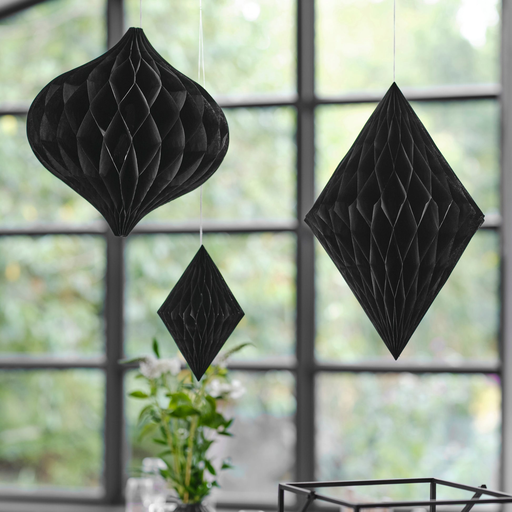 Each pack contains 3 x Hanging Wedding Decorations: 1 x Large diamond decoration measuring 40cm (H), 1 x Medium tapered decoration measuring 30cm (H), 1 x Small diamond decoration measuring 20cm (H).