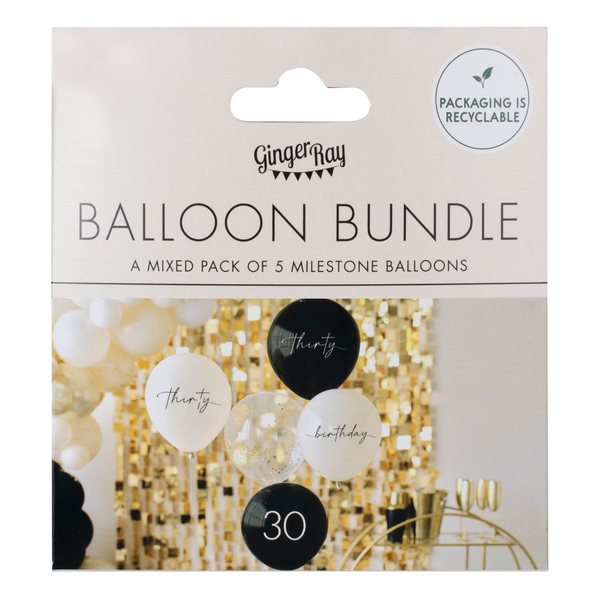 1 x 12” Nude Balloon with ‘birthday’ font, 1 x 12” Black balloon with ‘thirty’ balloon, 1 x 12” Nude balloon with ‘thirty’ font, 1 x 12” Clear balloon with champagne gold shredded confetti and 1 x 12” Black balloon with ‘30’ font.