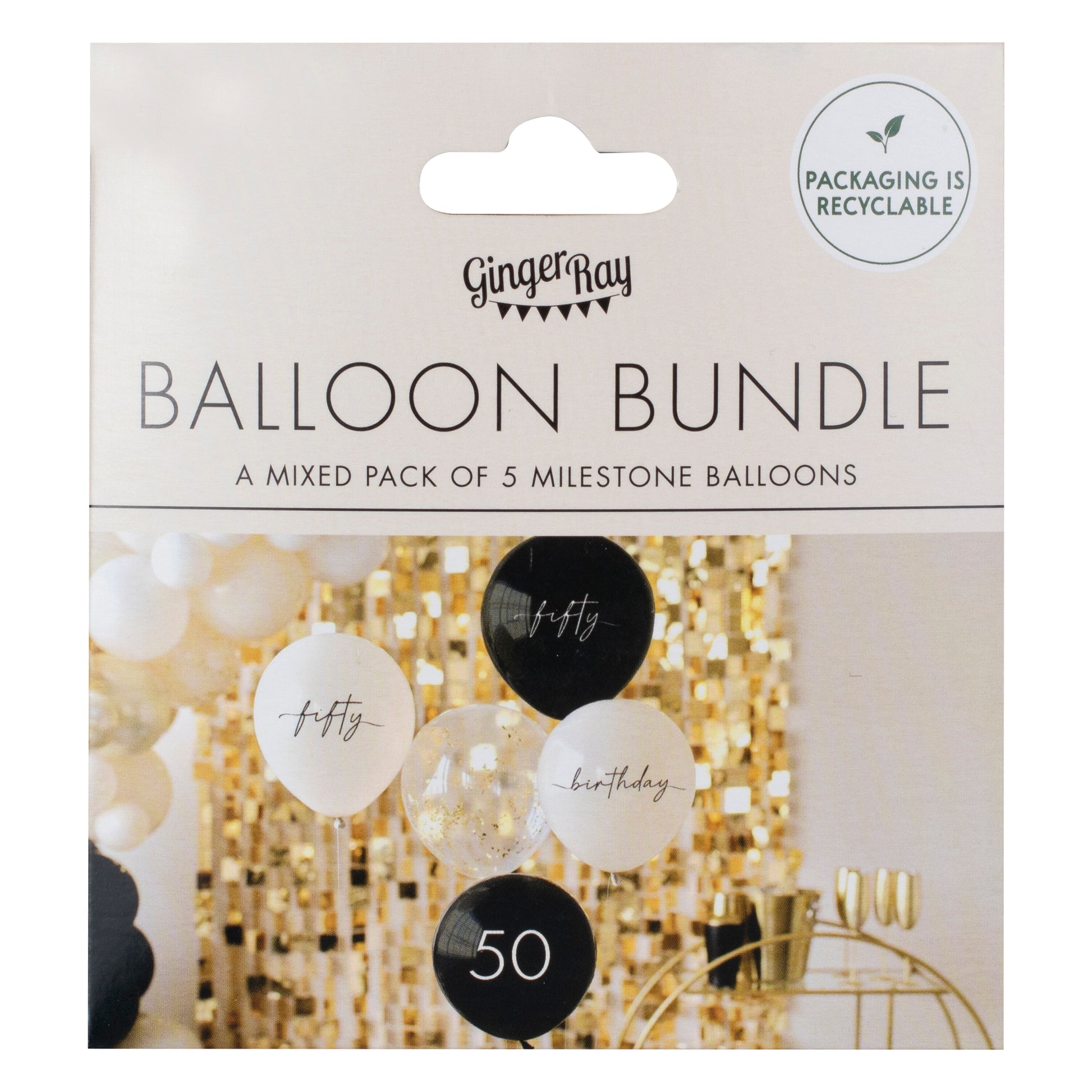 1 x 12” Nude Balloon with ‘birthday’ font, 1 x 12” Black balloon with ‘fifty’ balloon, 1 x 12” Nude balloon with ‘fifty’ font, 1 x 12” Clear balloon with champagne gold shredded confetti and 1 x 12” Black balloon with ‘50’ font.