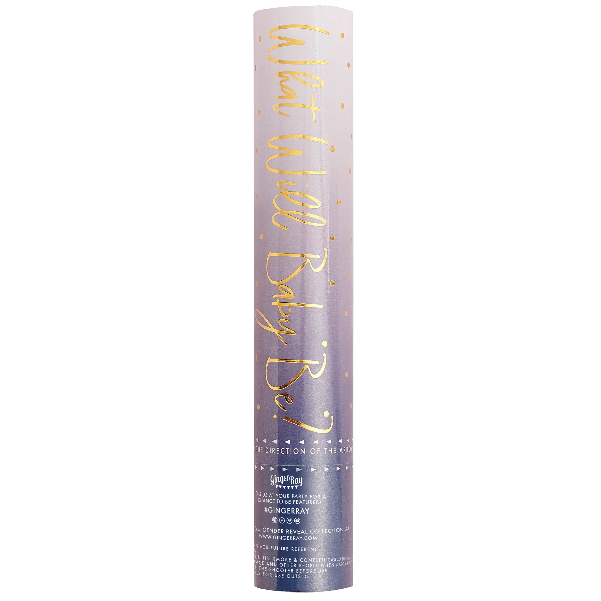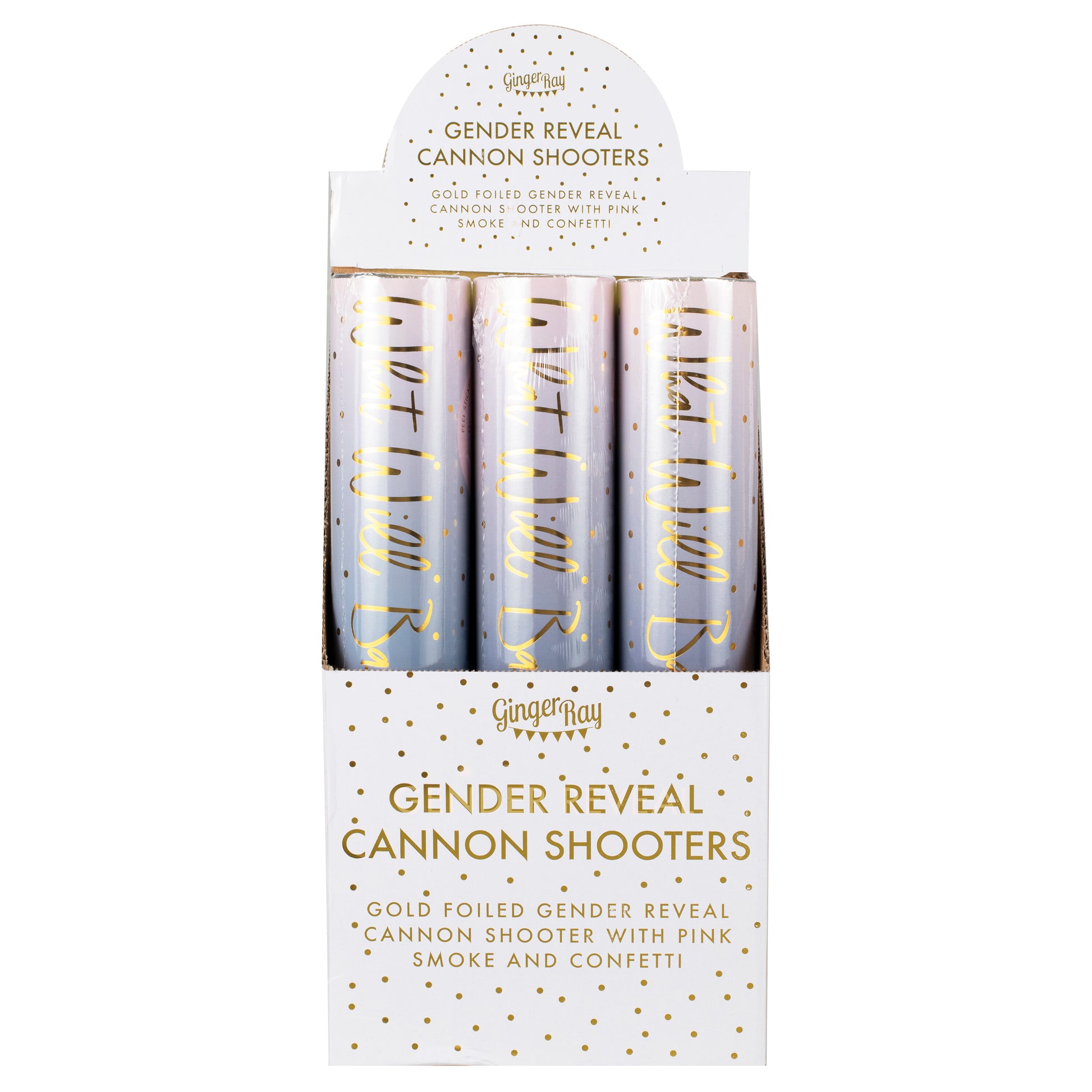 The pink and navy packaging is gender neutral so family and friends will not know what colour will come cascading out the cannon, revealing a blue confetti explosion. There is a blue sticker on the cannon to identify the blue confetti inside. Remove the sticker before your guests arrive to keep the gender a mystery!