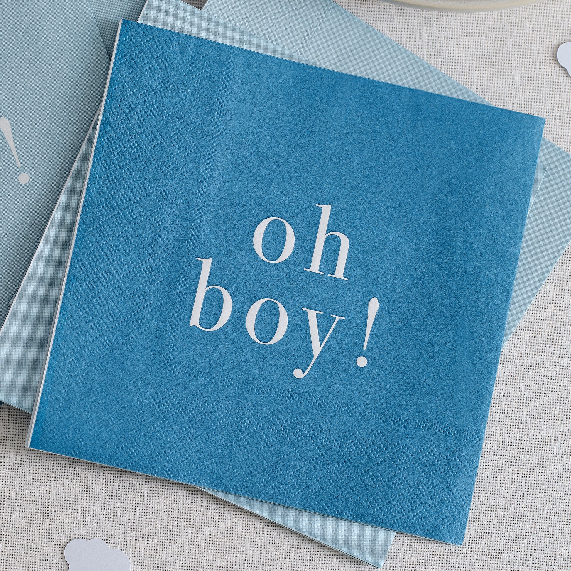 16 x blue 'Oh Boy!' paper napkins at 16.5cm high by 16.5cm wide