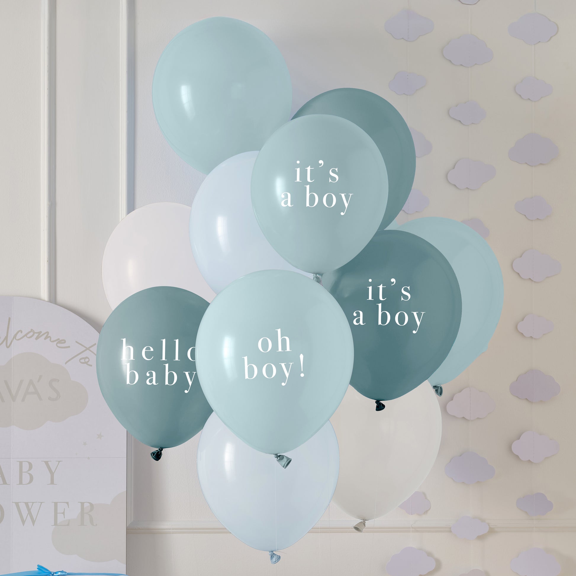 11 x 12" blue balloons with 'it's a boy', 'hello baby' and 'oh boy!' slogans