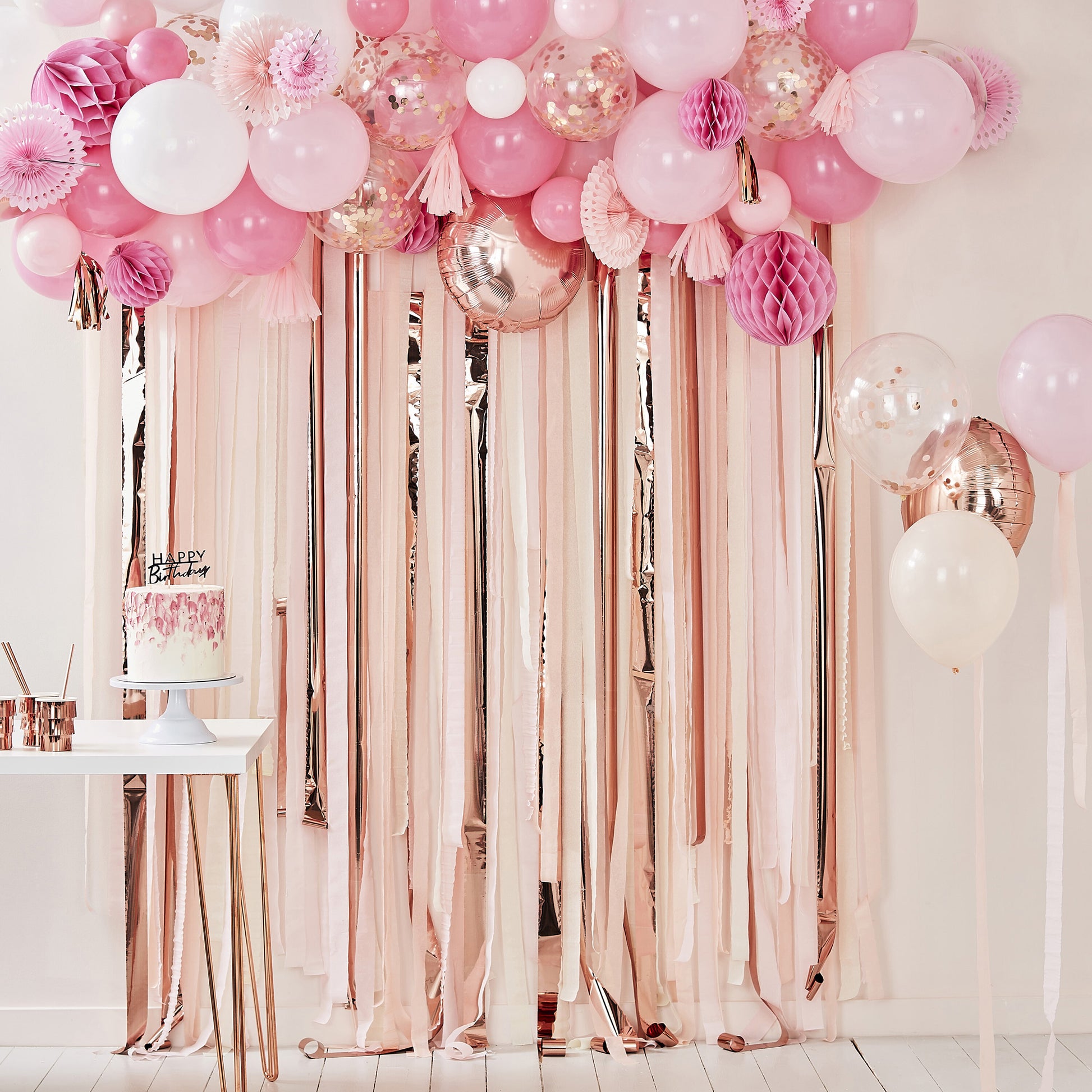 Each pack contains 70 White, pink and rose gold confetti balloons in 5 and 12 inch, 4 rose gold 18inch round foil balloons, 6 pink paper honeycombs, 6 pink paper fans, 8 tassels in pink and rose gold with 4 meters of balloon tape, clear twine & glue dots. Product does not come with streamer backdrop.
