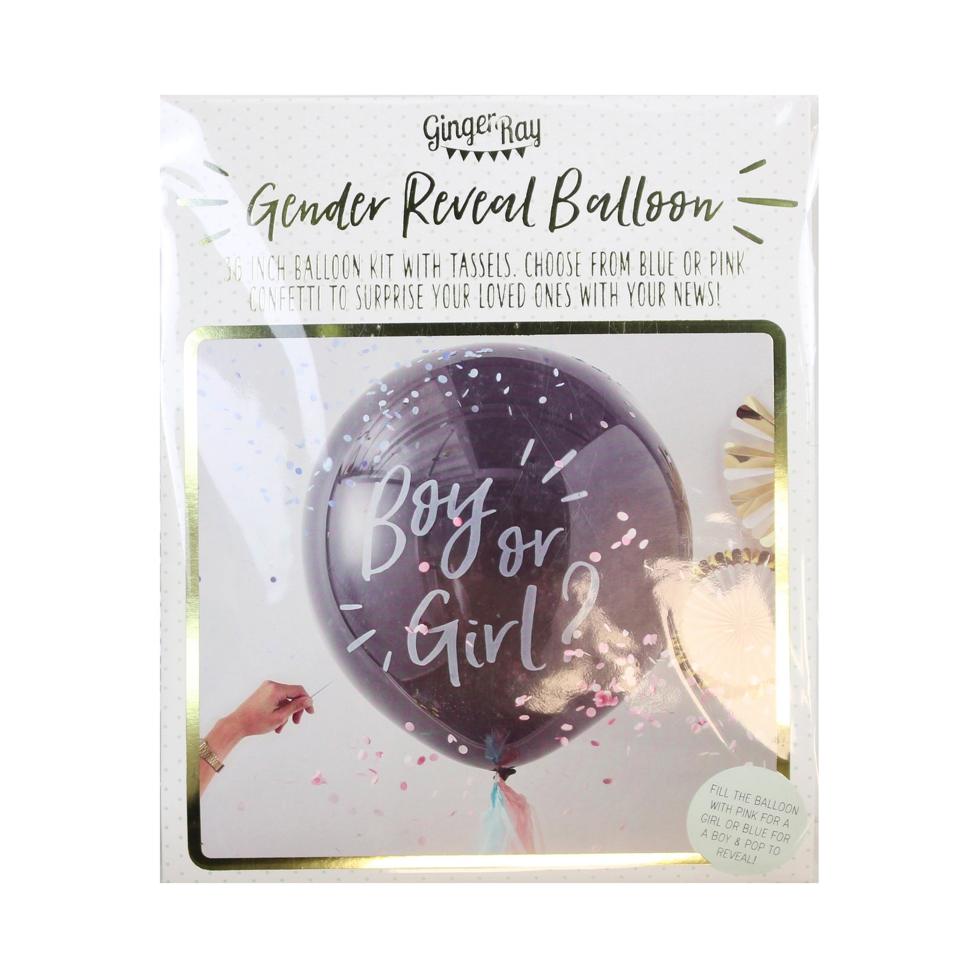 Our gender reveal balloon comes with pink and blue confetti - choose which colour and pop it inside the balloon. Add the tassels in pink and blue around the string so the reveal remains a surprise until the pop! Take a look at our gender reveal decorations to make your gender reveal extra special!