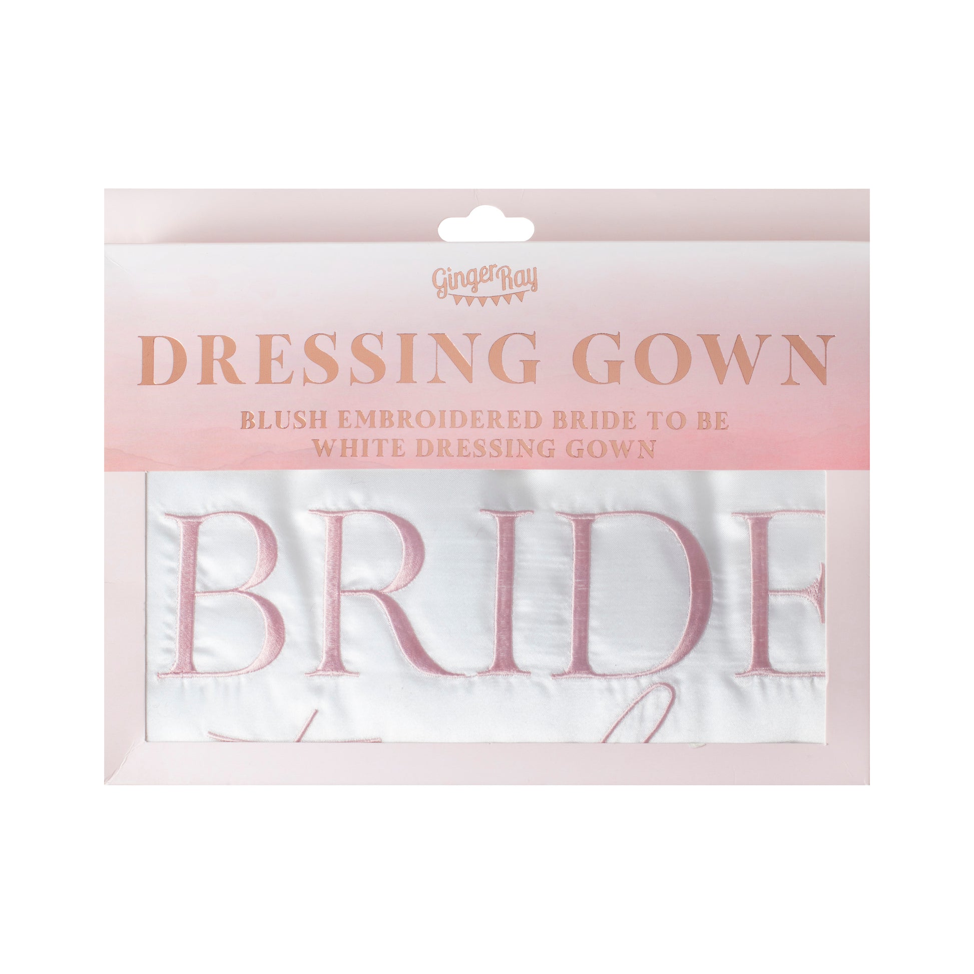 Get the hen party started in style with this cute white robe. Embroidered pink with Bride To be at the back this robe ties at the waist with a self-fabric belt. Pull on the robe grab some bubbles and celebrate your hen in style!