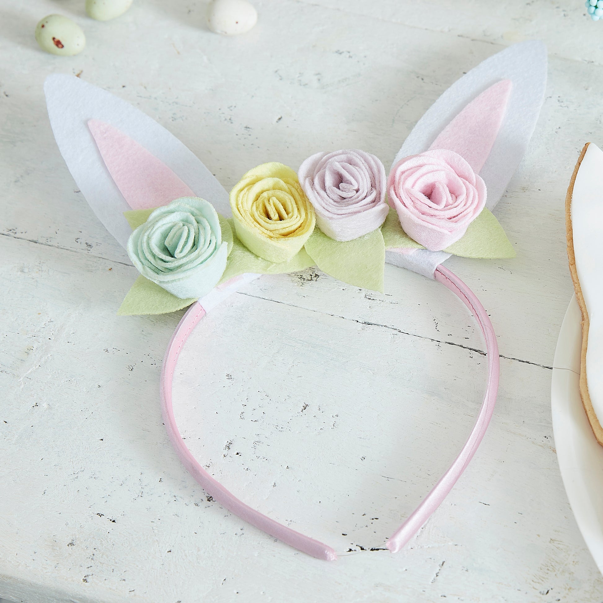 A pink satin headband with pastel flowers, these egg-stra cute bunny ear headbands are the perfect Easter accessory!