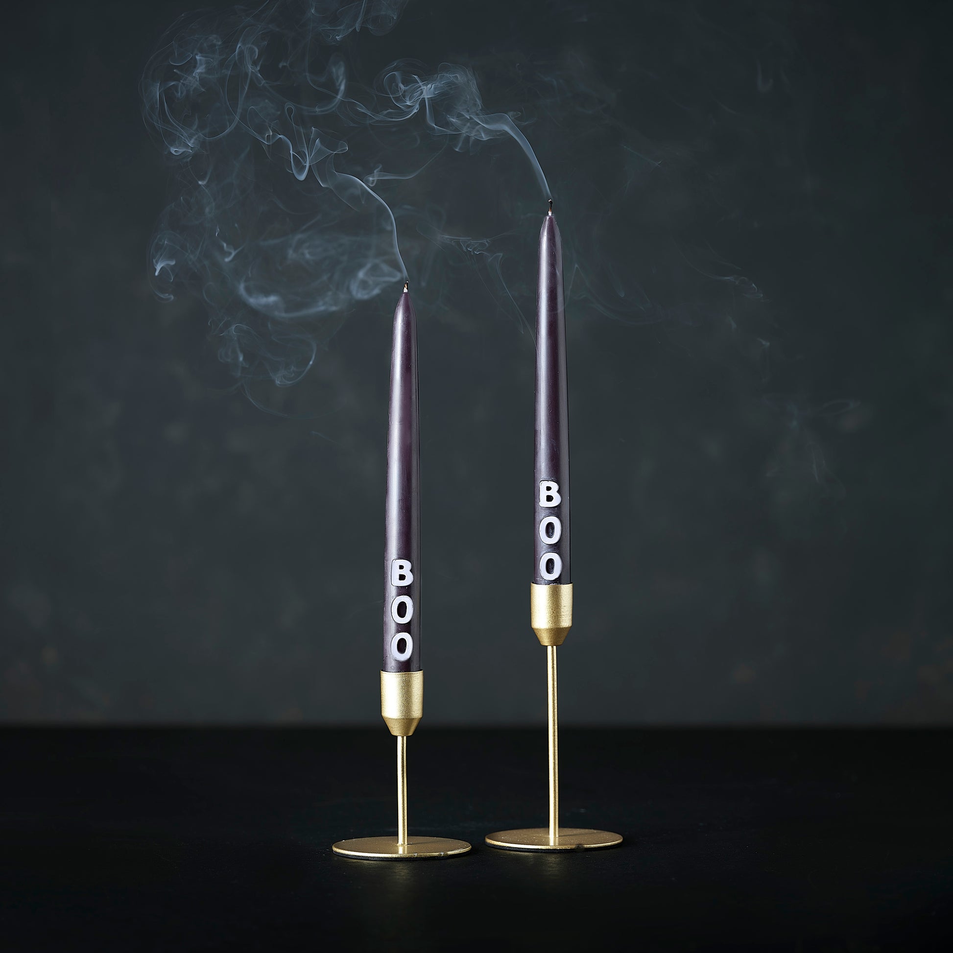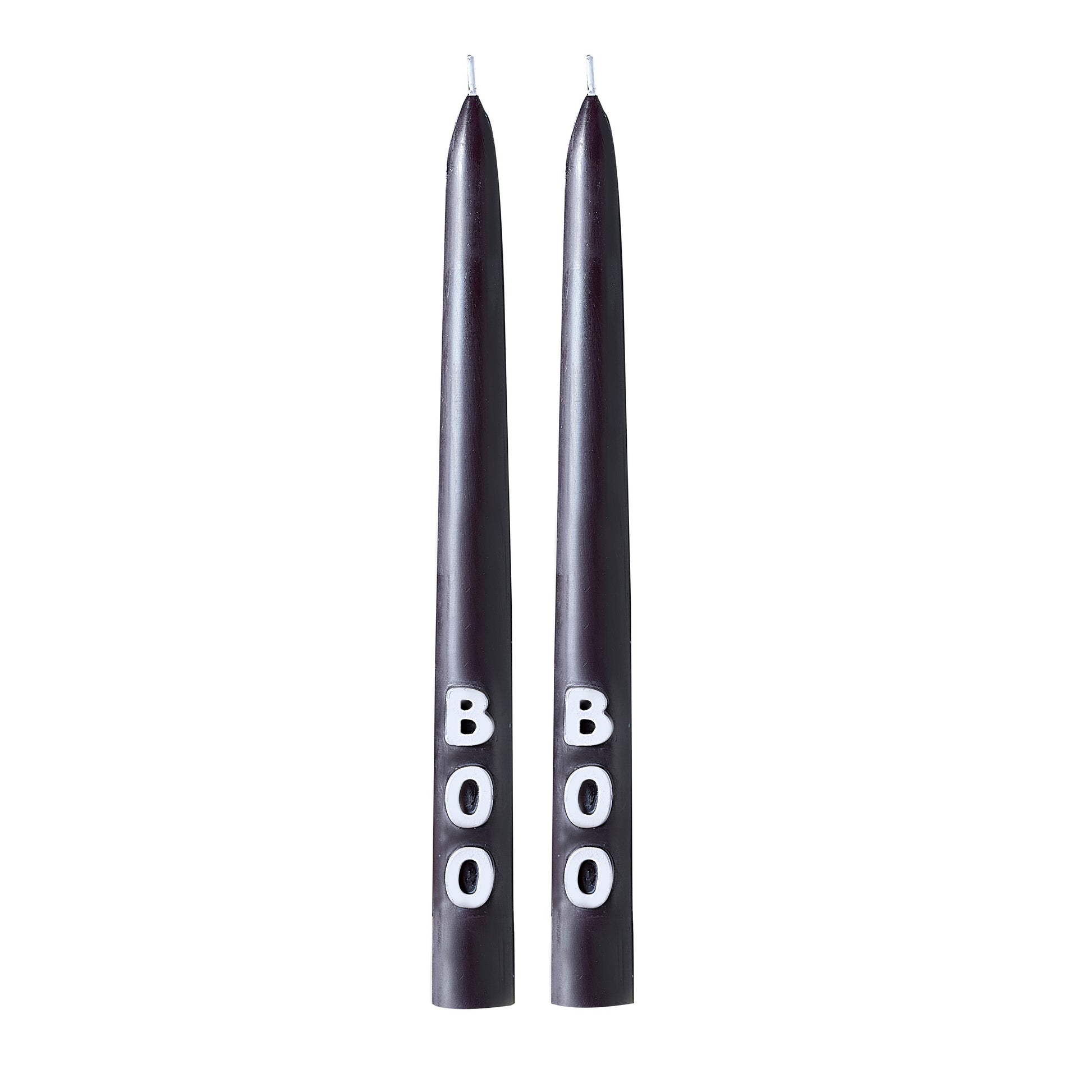 Each pack contains 2 x black non-scented tapered dinner candles at 24cm H x 2.2cm W with 3D moulded 'BOO' letters.