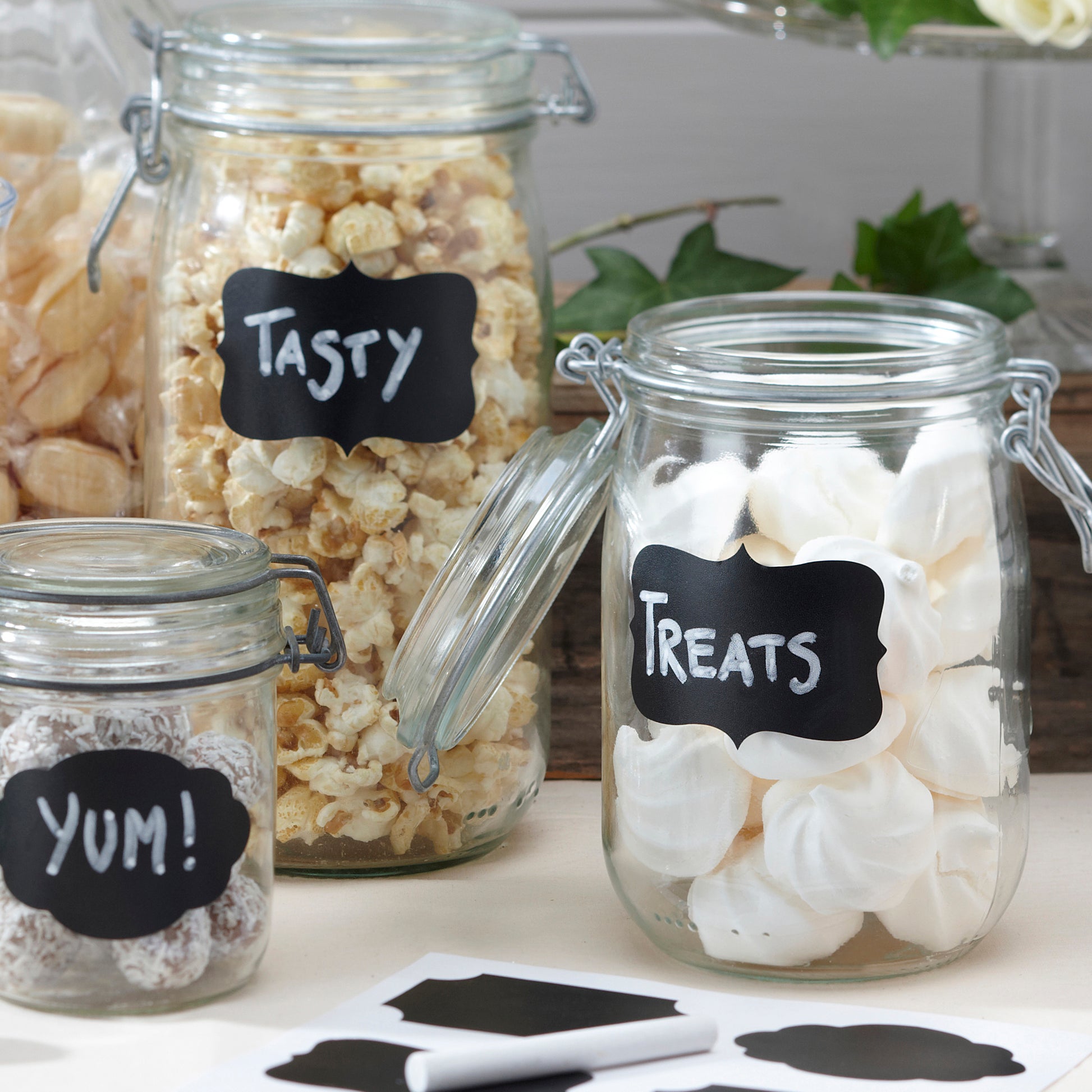 A pack of 12 reusable chalk effect sticker labels, great for using on candy