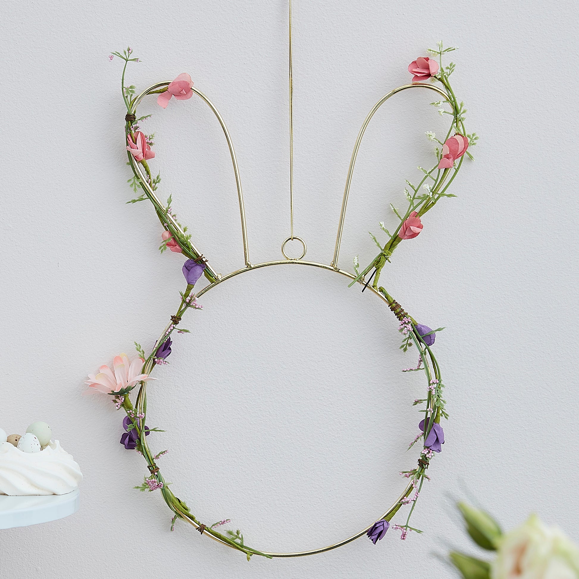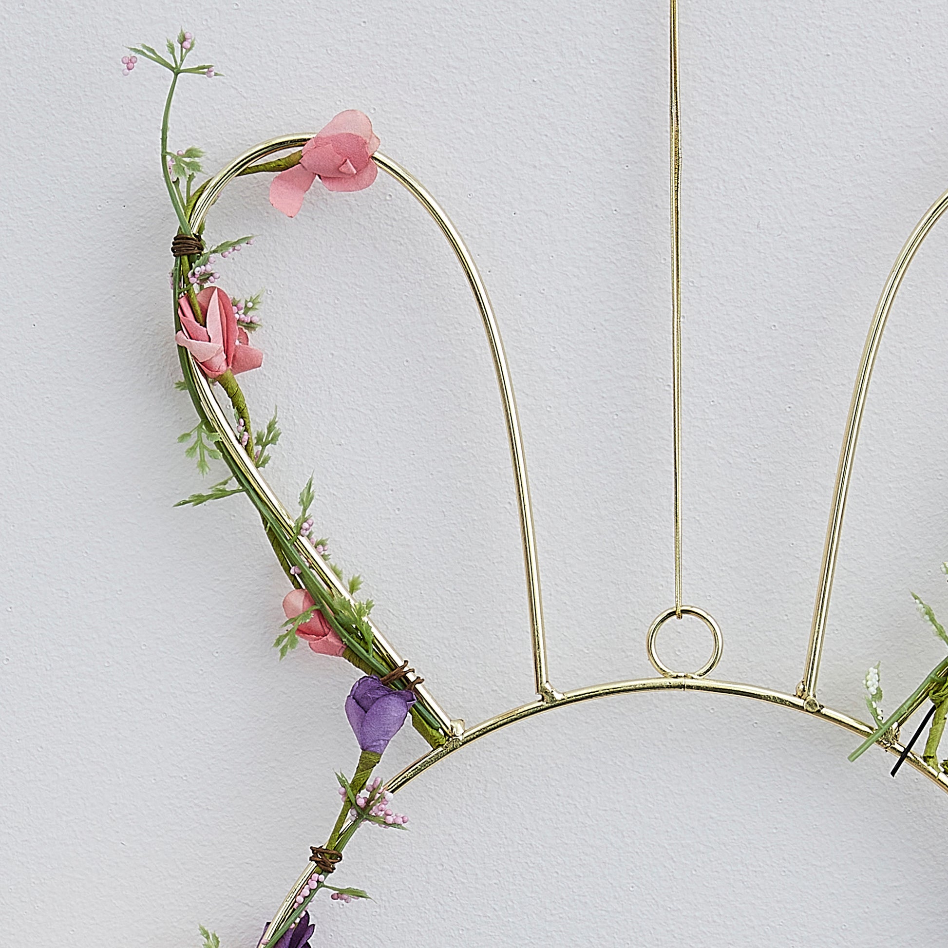This bunny shaped wreath is the cutest easter decoration, with gold wire detailing, gorgeous foliage and pastel flowers, it'll add a touch of spring to your home.