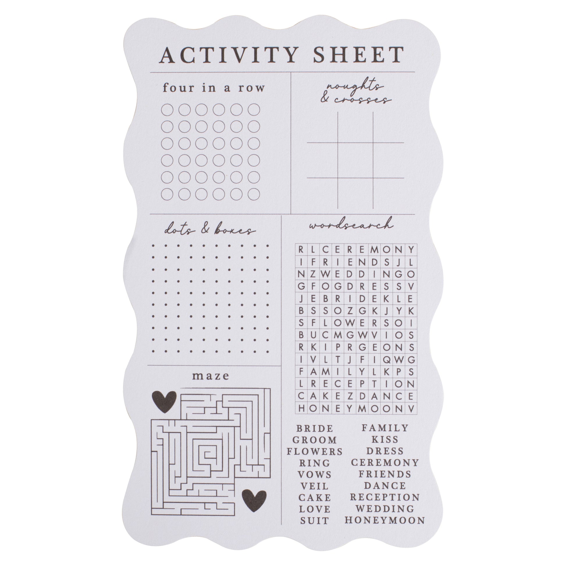 10 x wavy edge card wedding activity sheets at 17.5cm H x 10cm W