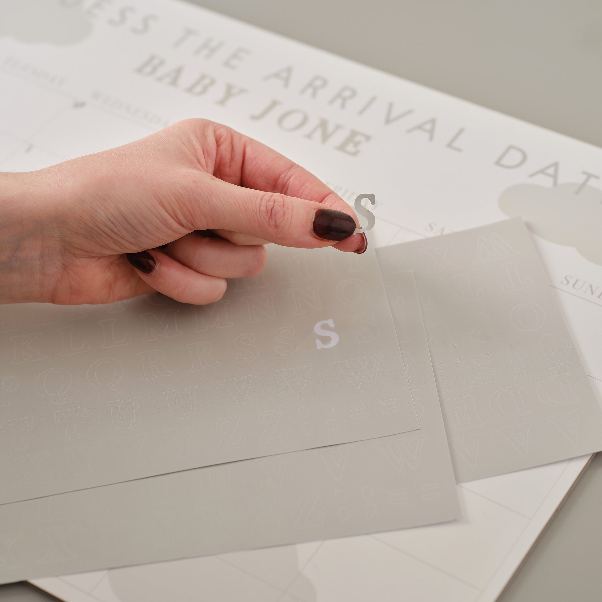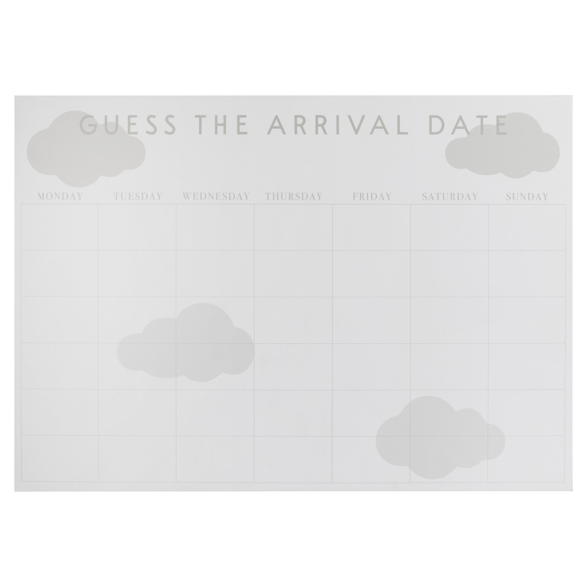 1 x white and grey card 'guess the arrival date' baby shower game at 29.7cm high by 42cm wide with stickers to customise.