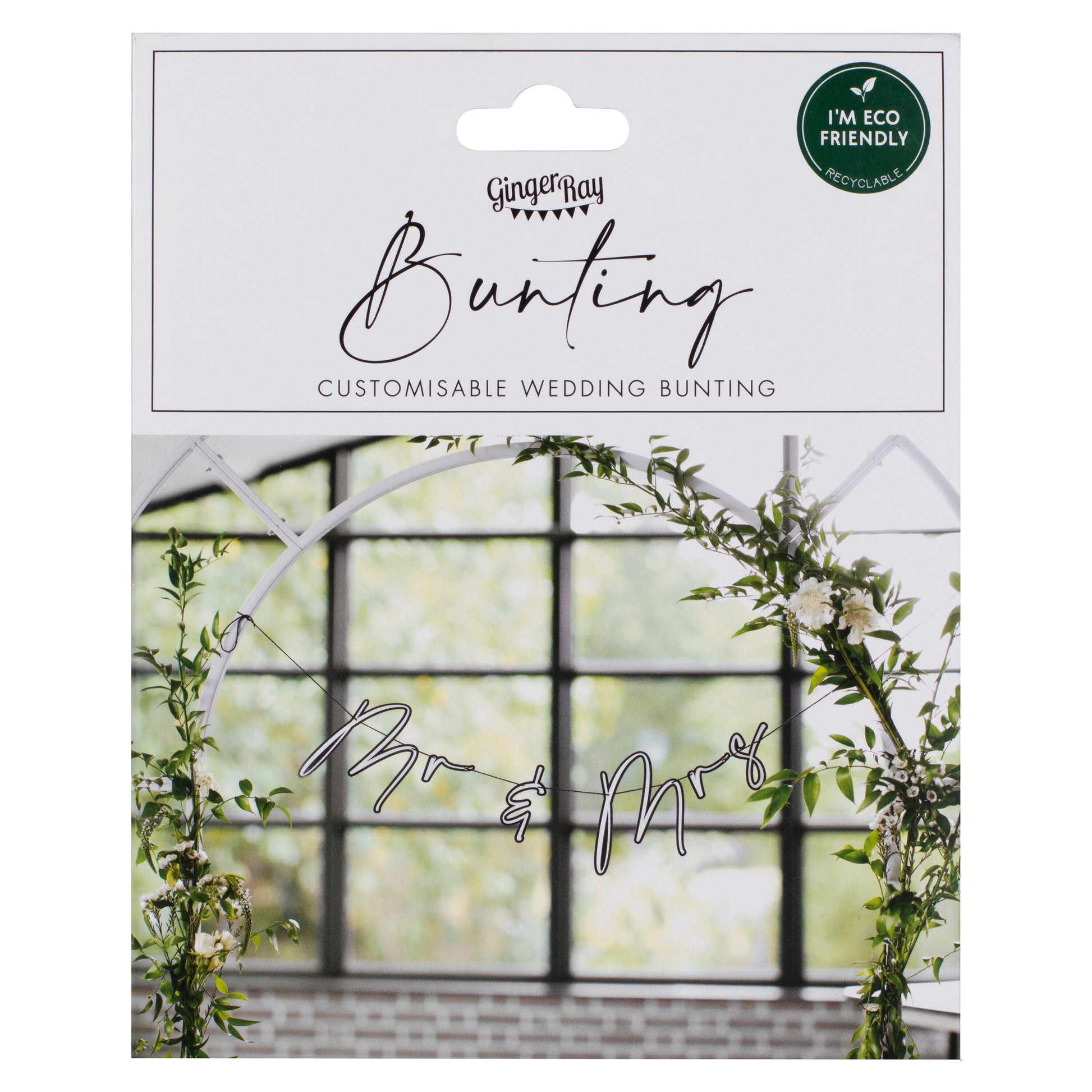 This customisable Mr and Mrs Bunting measures 7cm (H) x 200cm (W) comes with 2 x M letters, 2 x R letters, 2 x S letters and 1 x & symbol with 2m of Black jute twine for easy assembly.