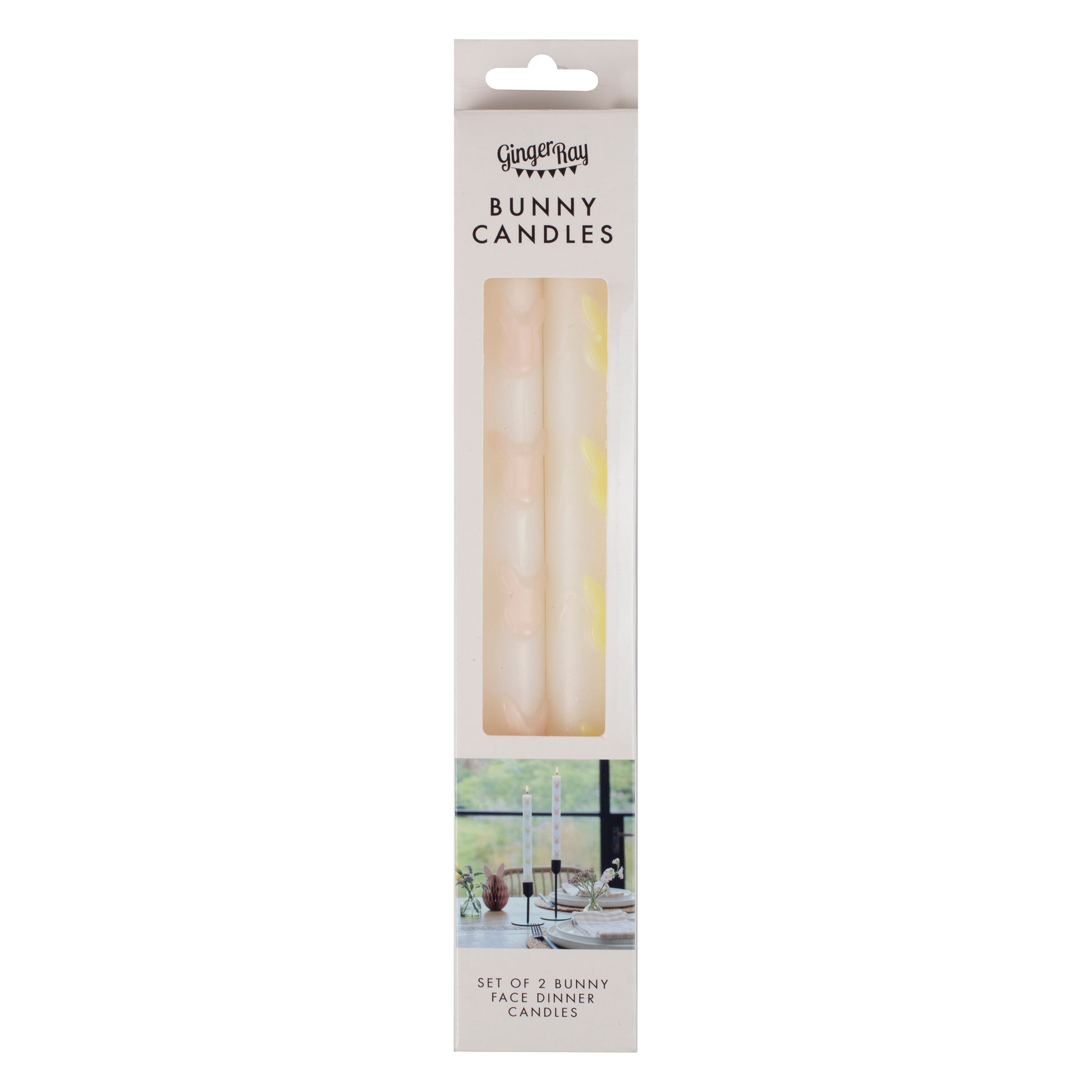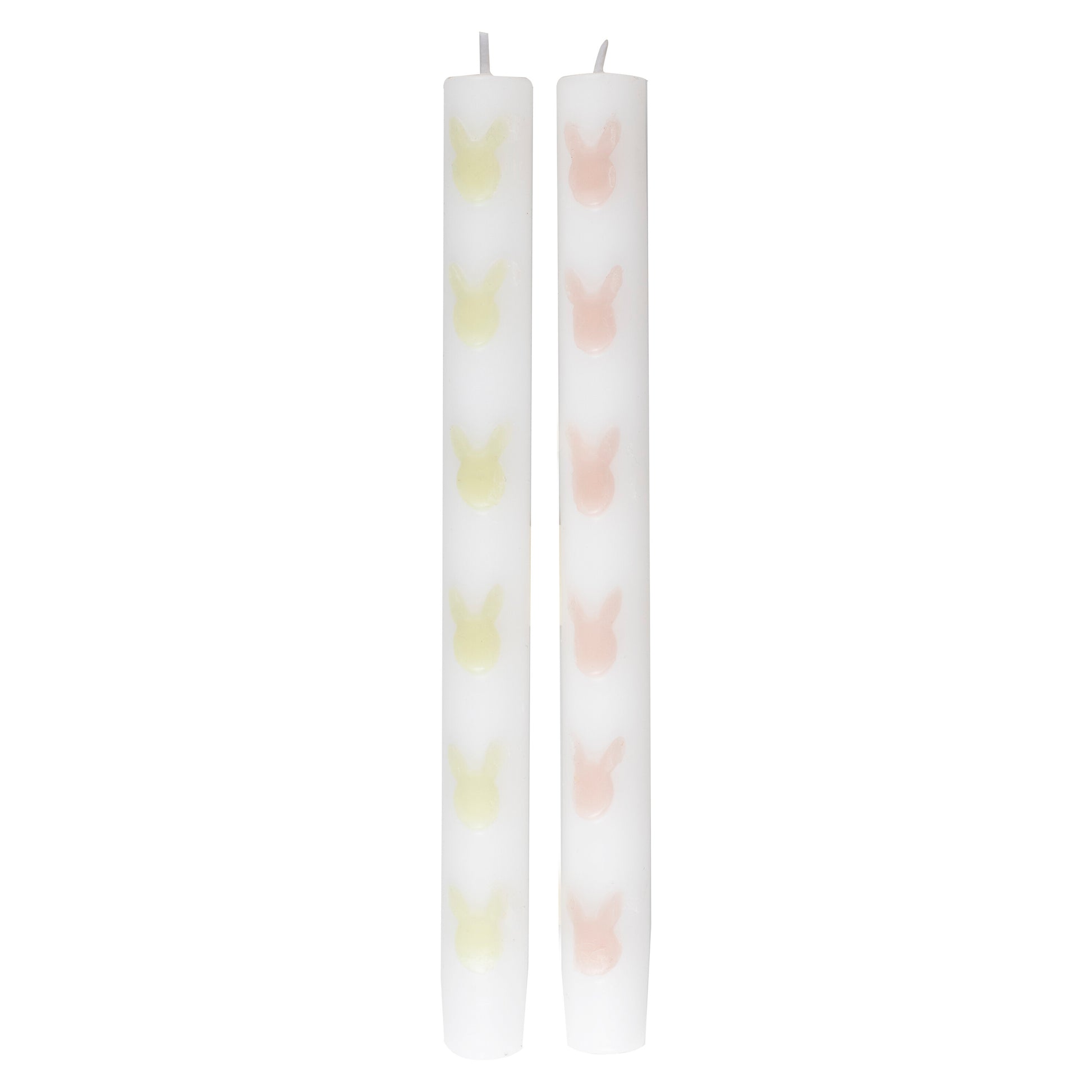 2 x White dinner candles with green and pink pastel bunny heads, measuring 24cm (H) x 2.2cm (W)