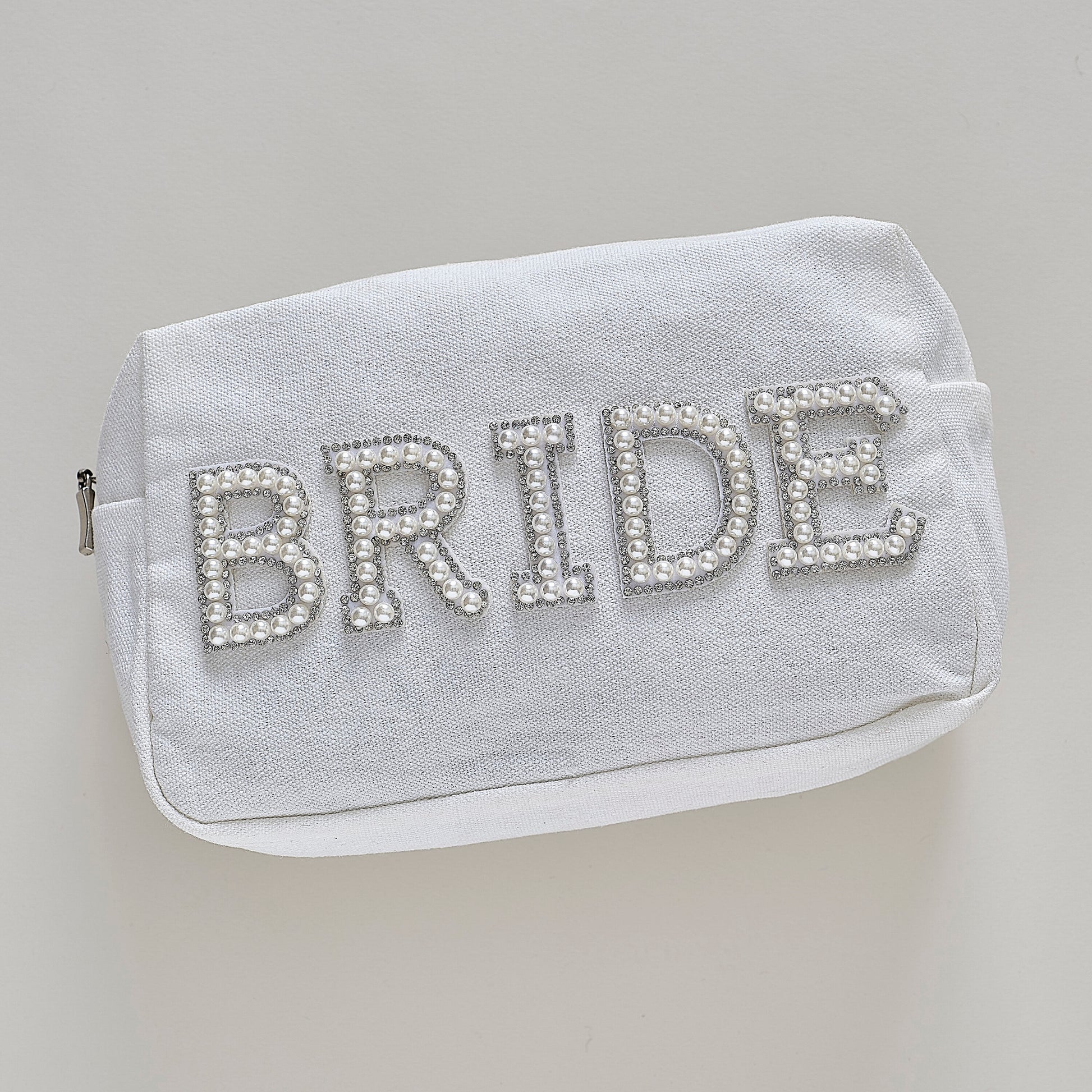 1 x 'Bride' pearl-embellished white cosmetic bag, measuring 20cm (W) x 12cm (H) made from white cotton with silver zipper.