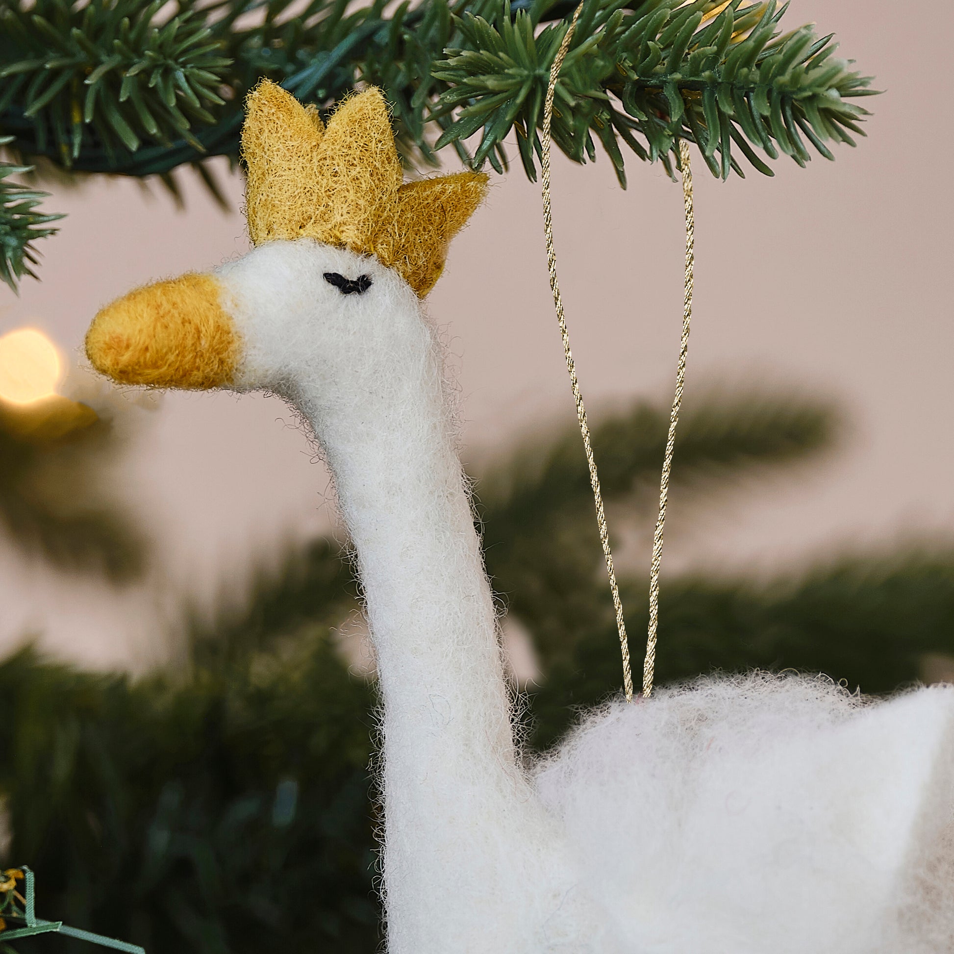 1 x Felt swan Christmas decoration with gold crown, measuring 10cm (H).