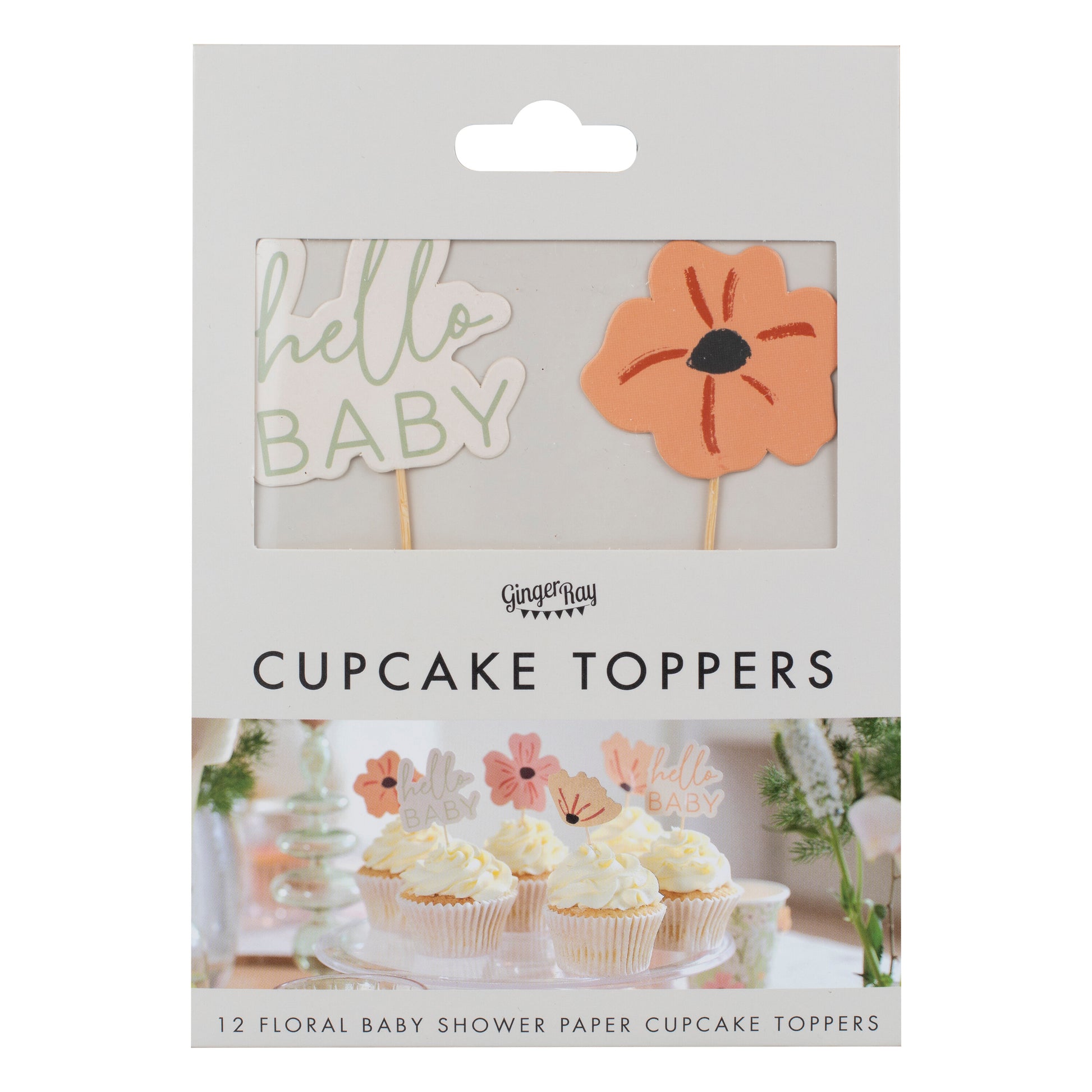 12 x floral paper baby shower cake toppers, with 4 'Hello Baby' toppers and 8 floral toppers.