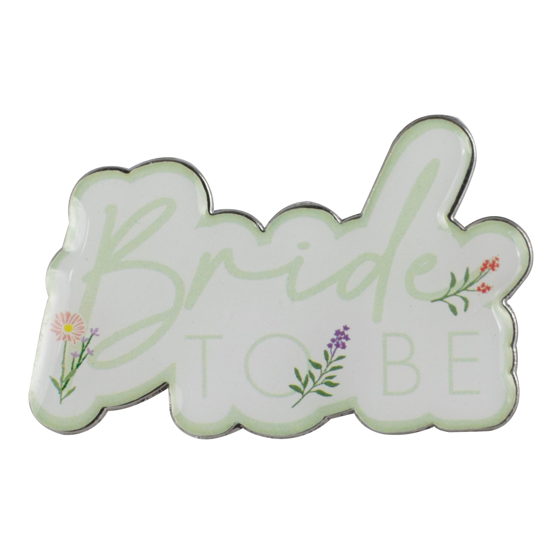 1 x Bride-to-be enamel badge in silver metal with white and sage green print on front, measuring 3.3cm (H) x 5.3cm (W)