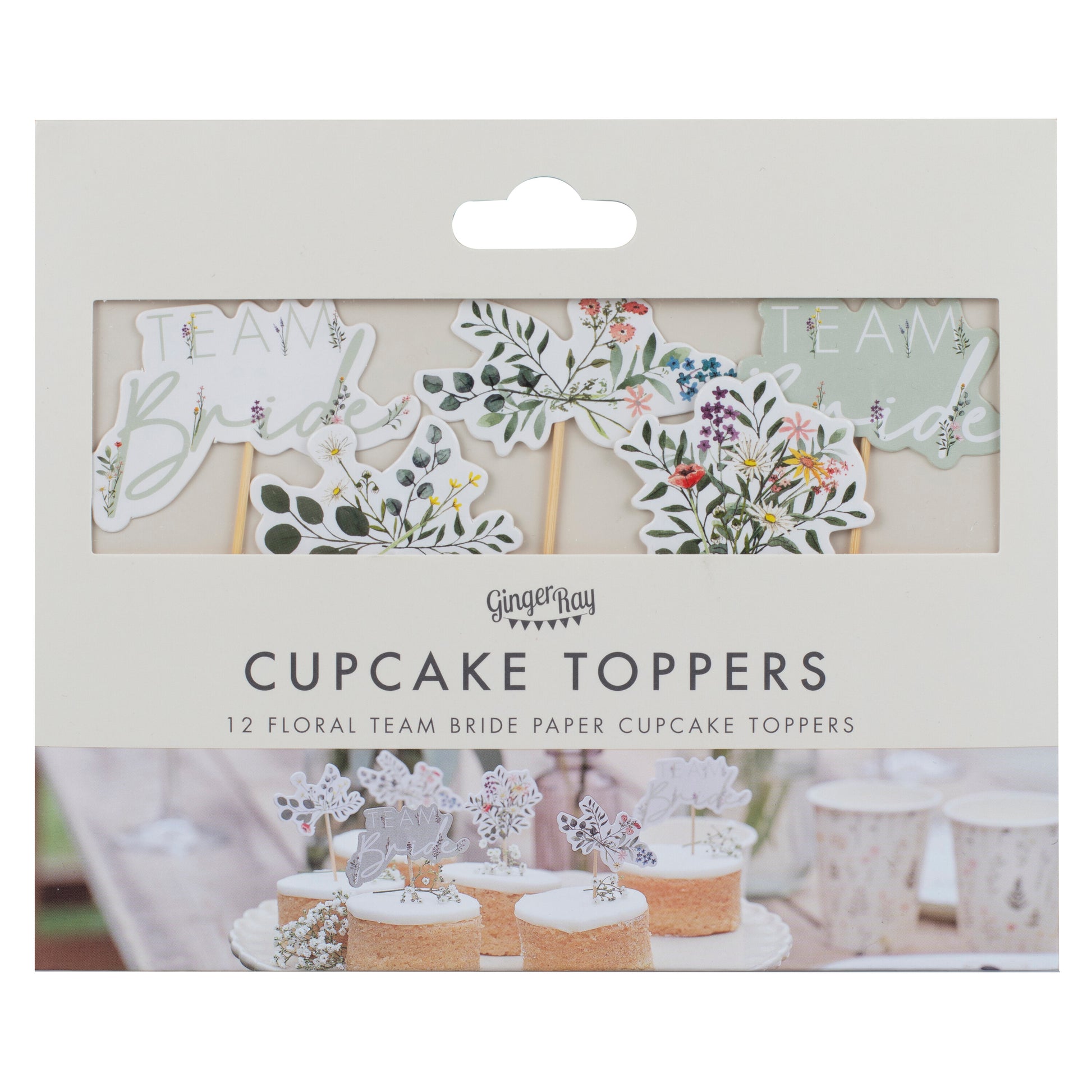 12 x Team Bride paper cupcake toppers with 10cm sticks: 6 x 'Team Bride', and 6 x floral toppers.