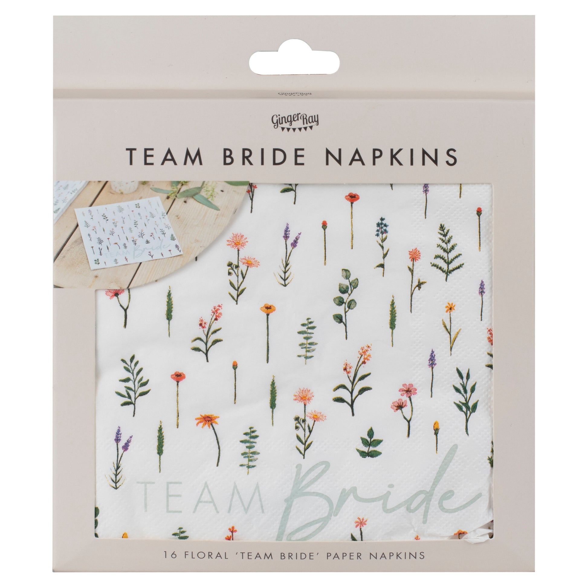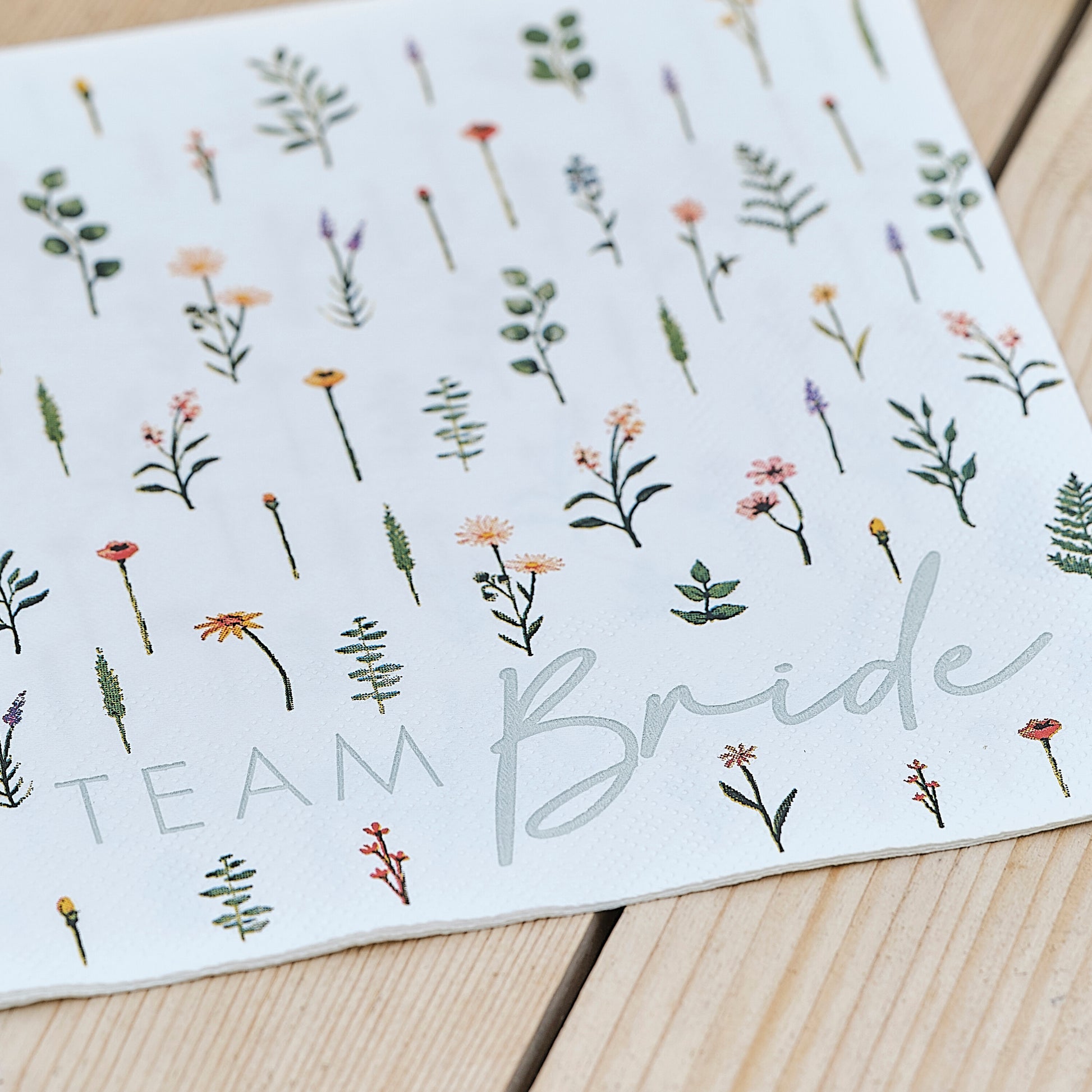 16 x Paper napkins with 'Team Bride' written on each one and a floral design printed