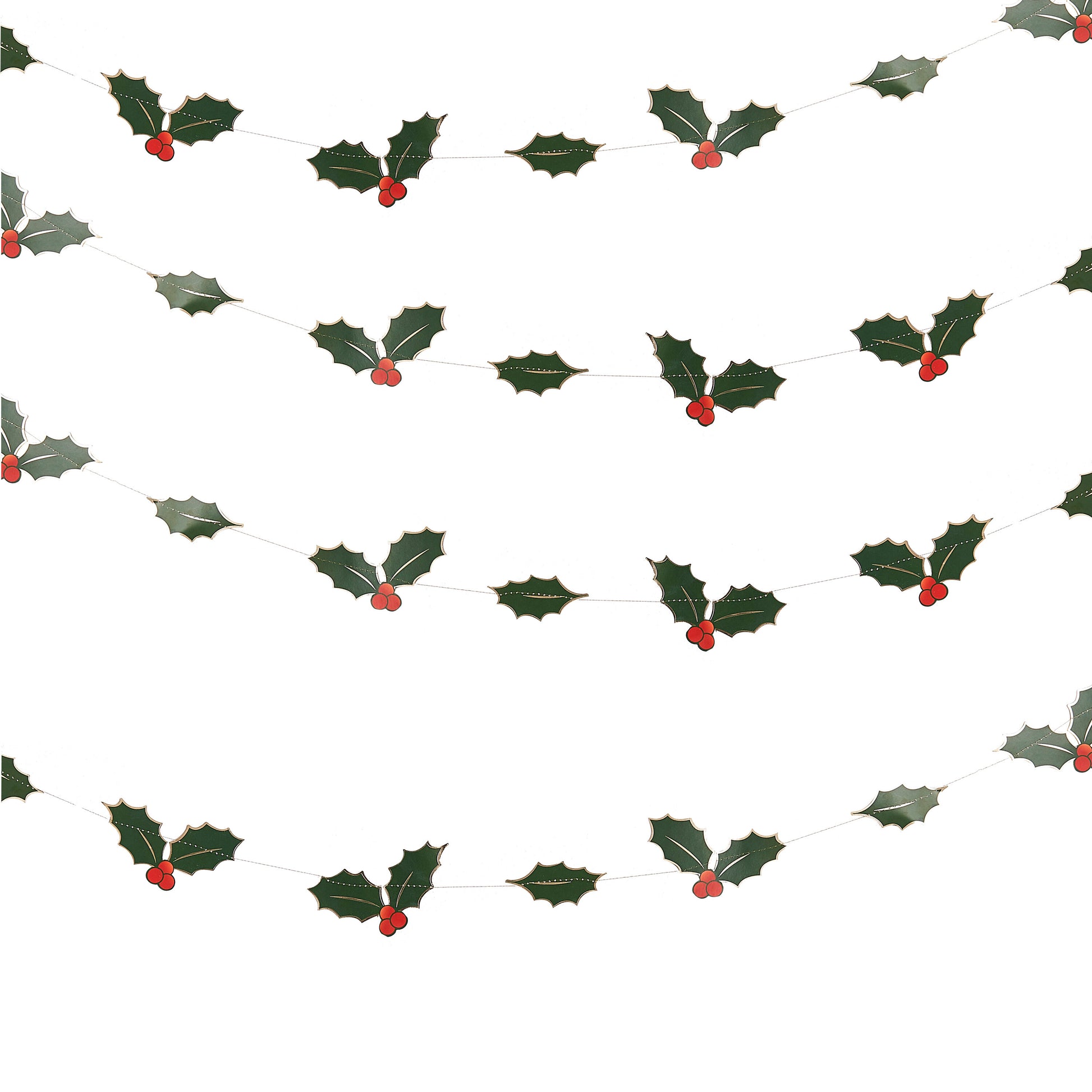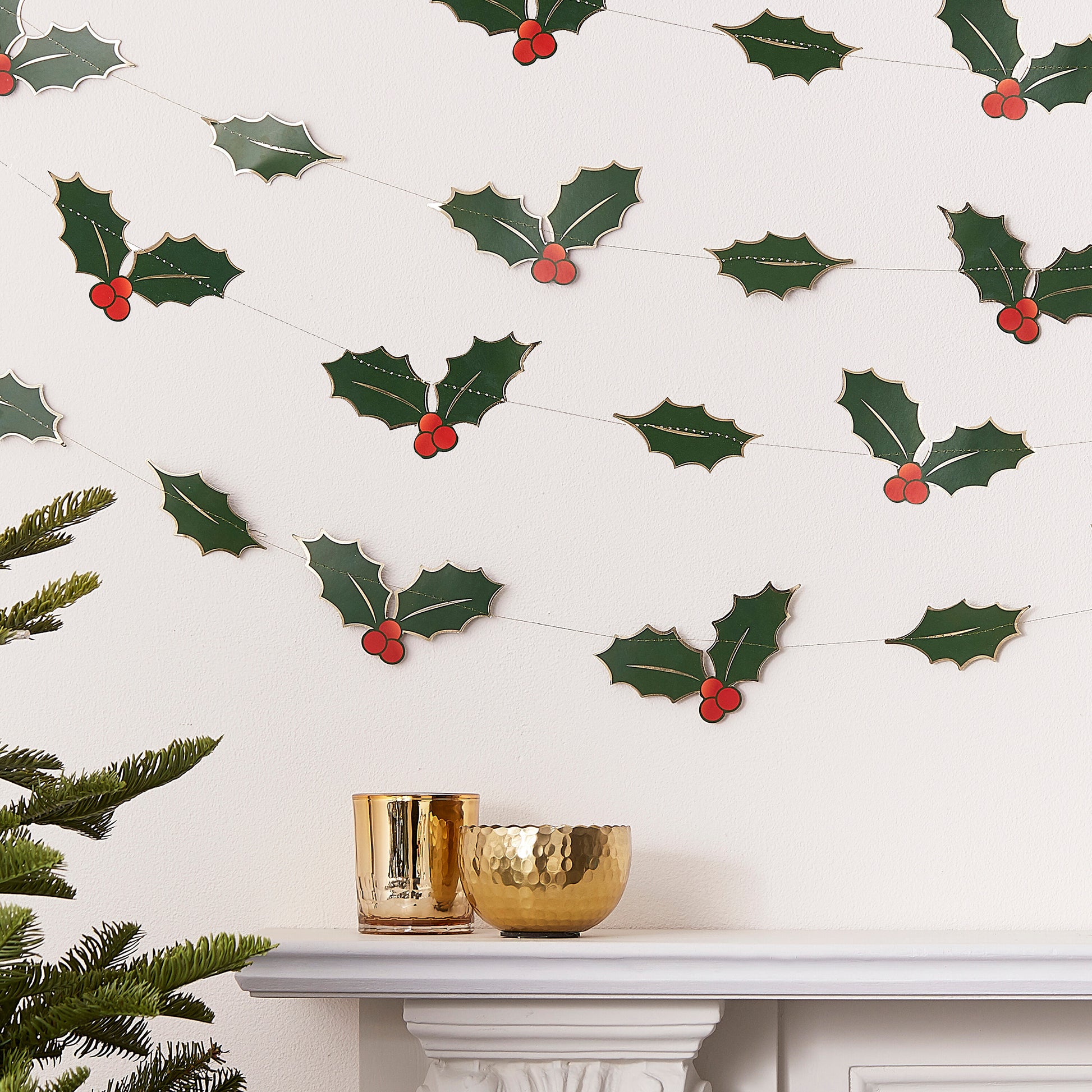 Style your home this Christmas with this festive decorative holly leaf backdrop. The traditional Christmas colours of green and red add a splash of colour from the holly and berries and the gold foil detail will shimmer under Christmas lights.