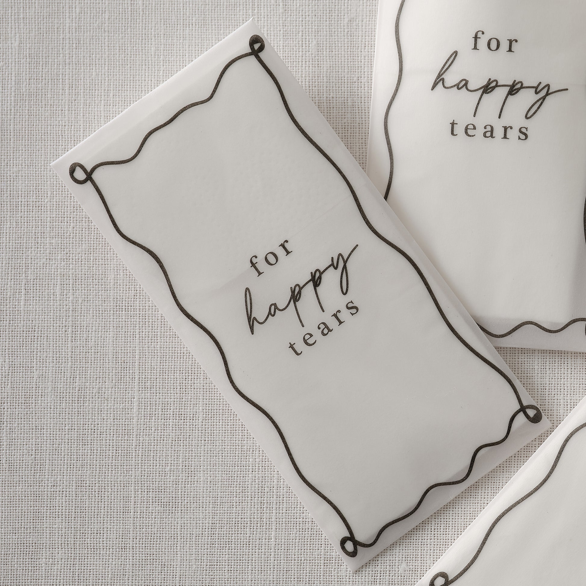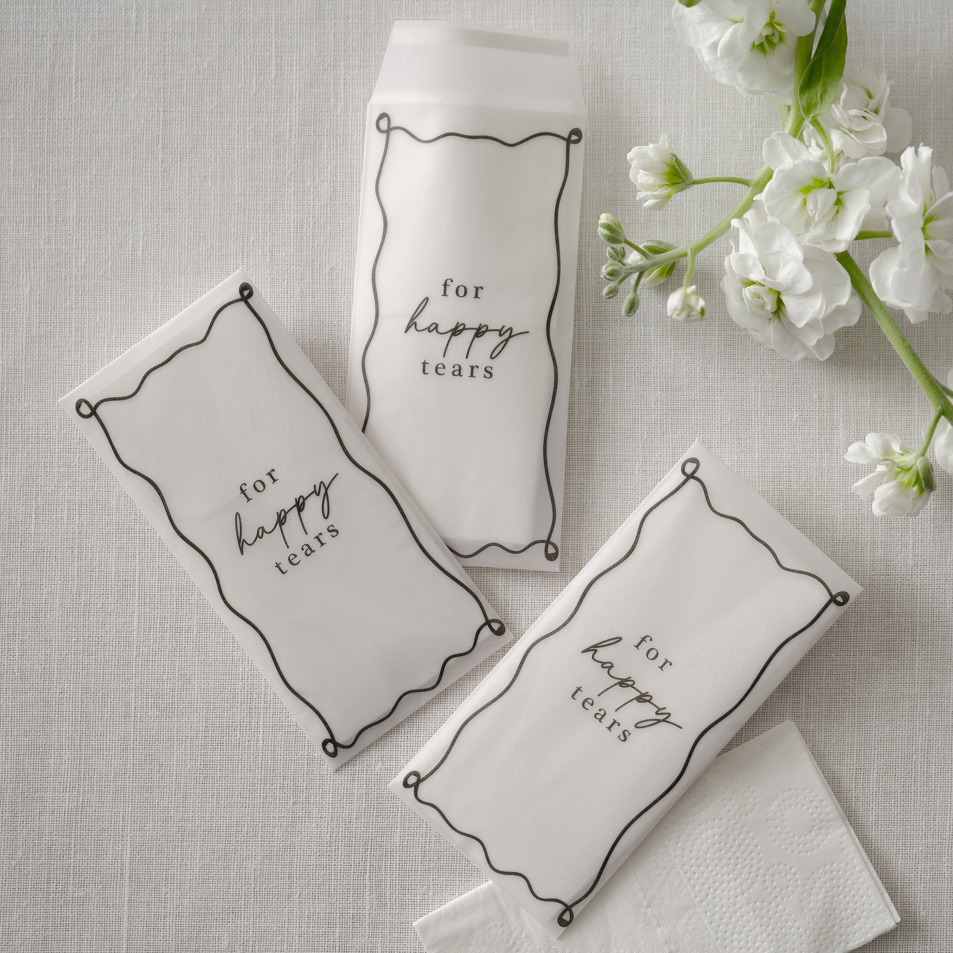 Add a thoughtful touch to your celebration with these "For Happy Tears" vellum tissue packs. Perfect for those emotional moments, these sweet and practical little gifts are ideal for sharing with your guests and keeping the tears of joy at bay!