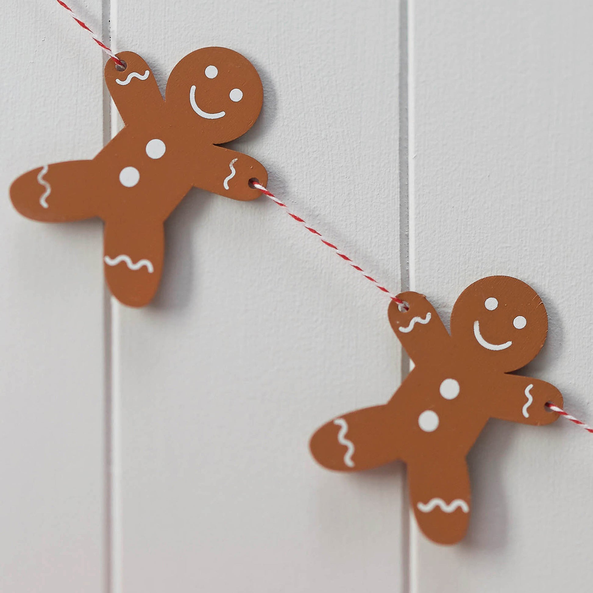 Each gingerbread man is an authentic brown baked colour with white features and is tied together with red and white twine. Perfect for decorating the edge of tables, hanging on walls in the kitchen maybe or just around the Christmas tree!