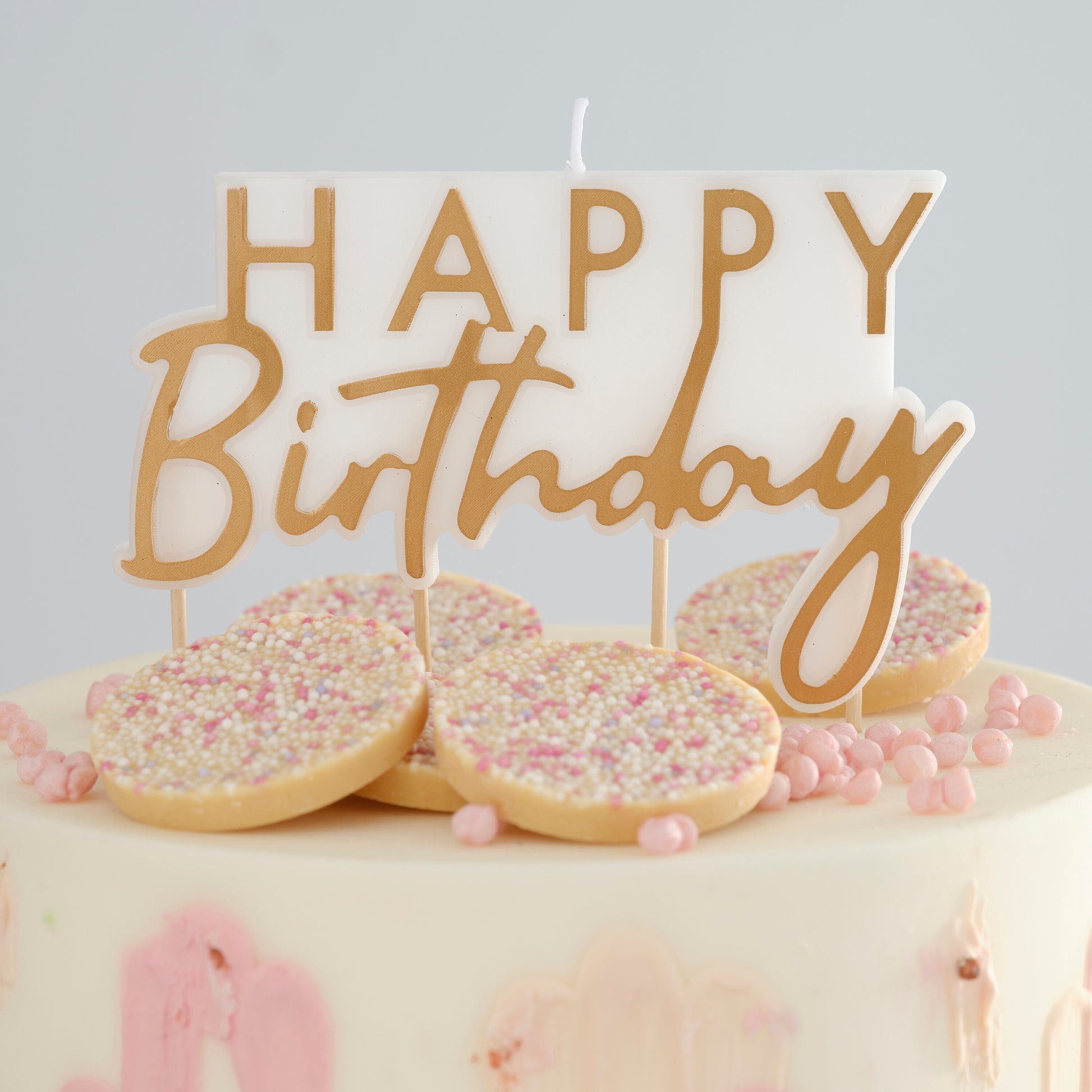 Make a wish on your special day with this gold and white Happy Birthday candle.