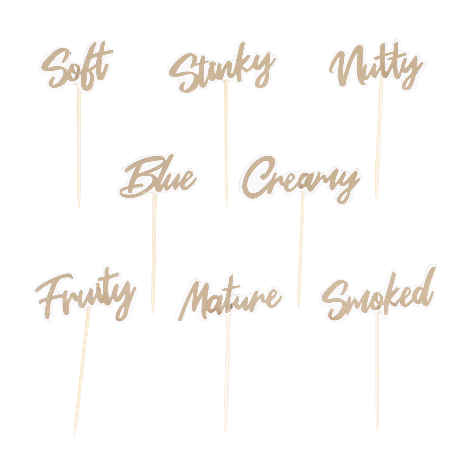 Each pick covers any cheese you might have on offer including - Blue, Creamy, Stinky, Mature, Smoked, Soft, Fruity and Nutty. The picks will mark their respective cheese in shining gold scripted foil. Each pack contains eight food picks to complete your Christmas cheese board.