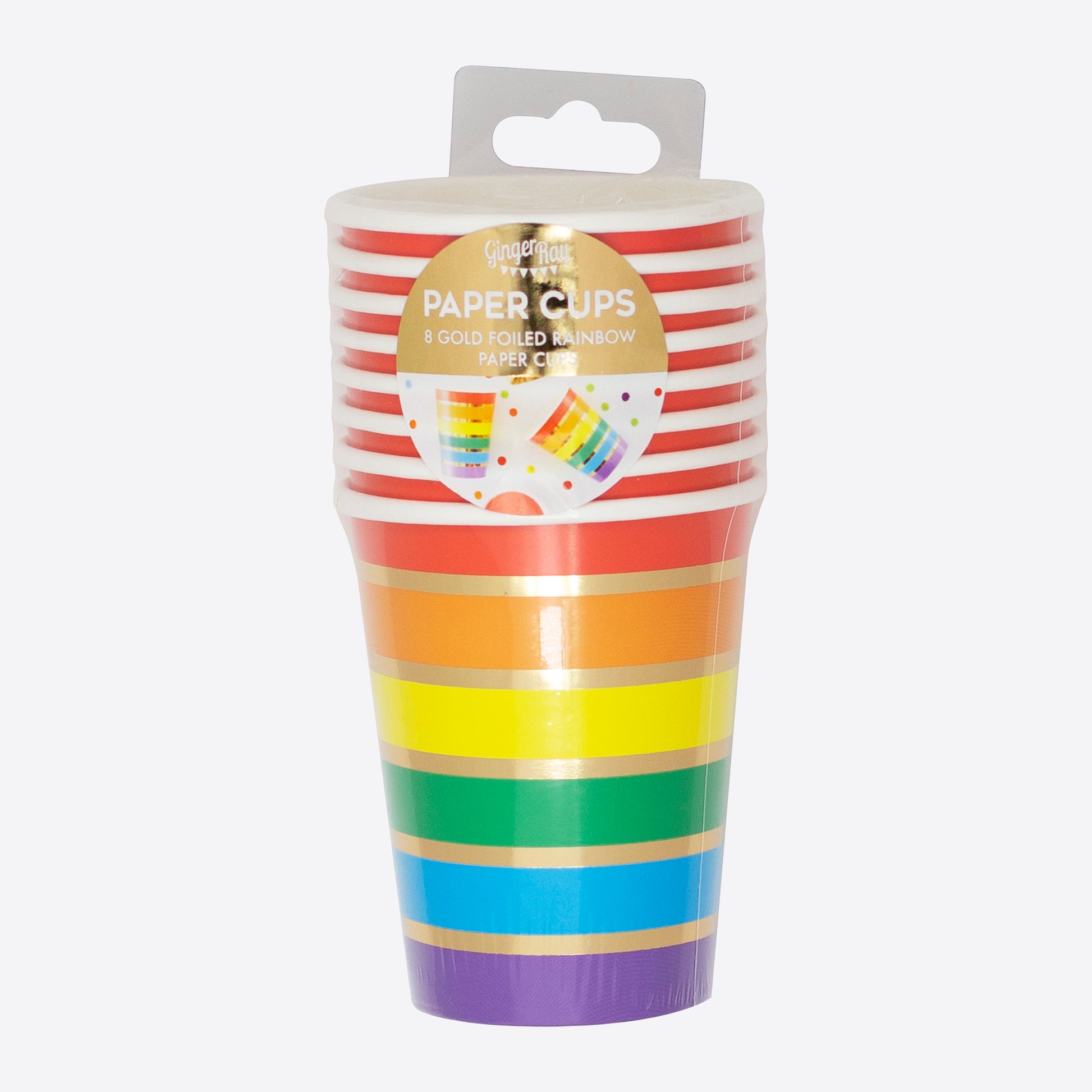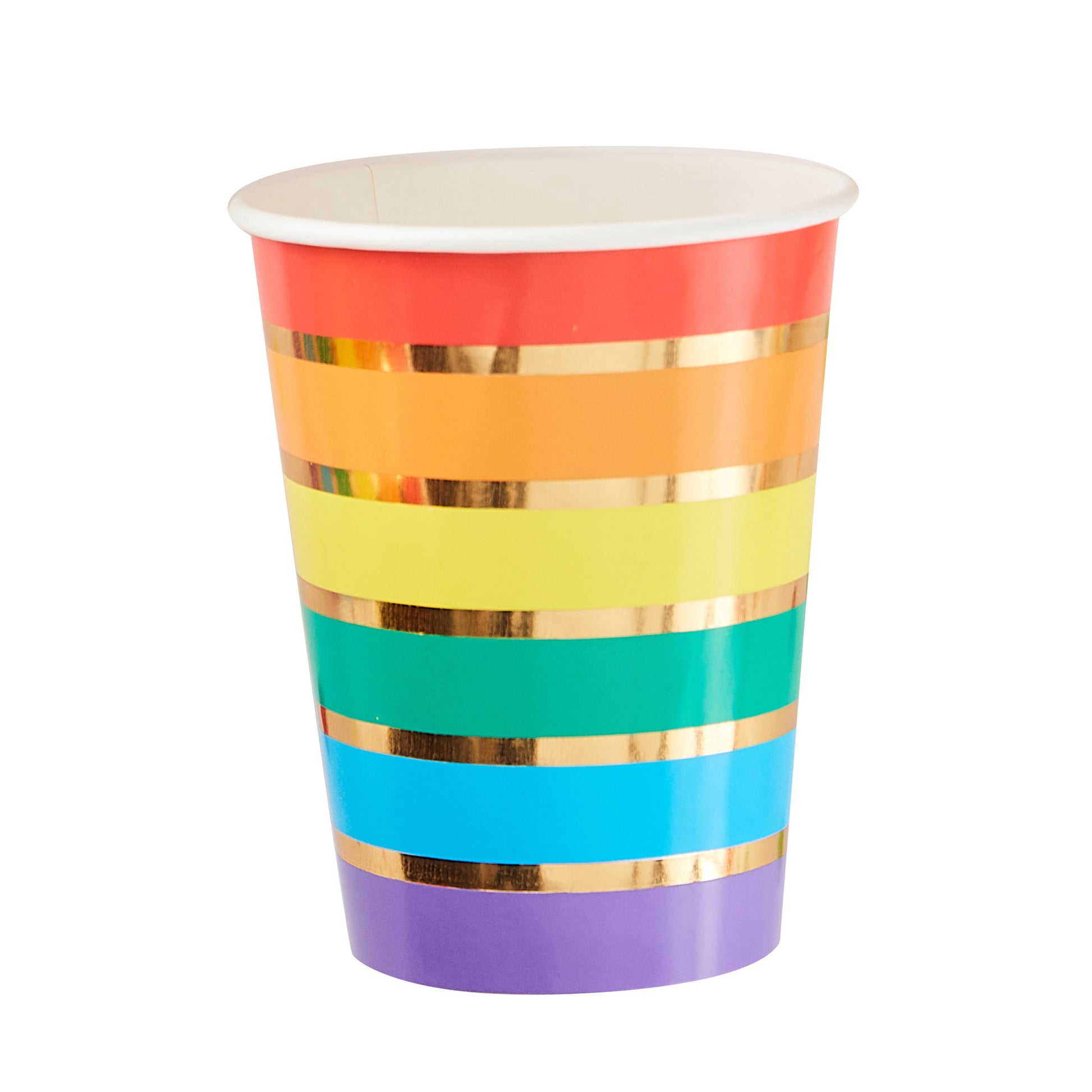 Perfect for any party these rainbow paper cups will look perfect with other rainbow party decorations for a fun and vibrant setup. The vivid colours pop against the shimmering gold metalic foiling and will brighten any venue.