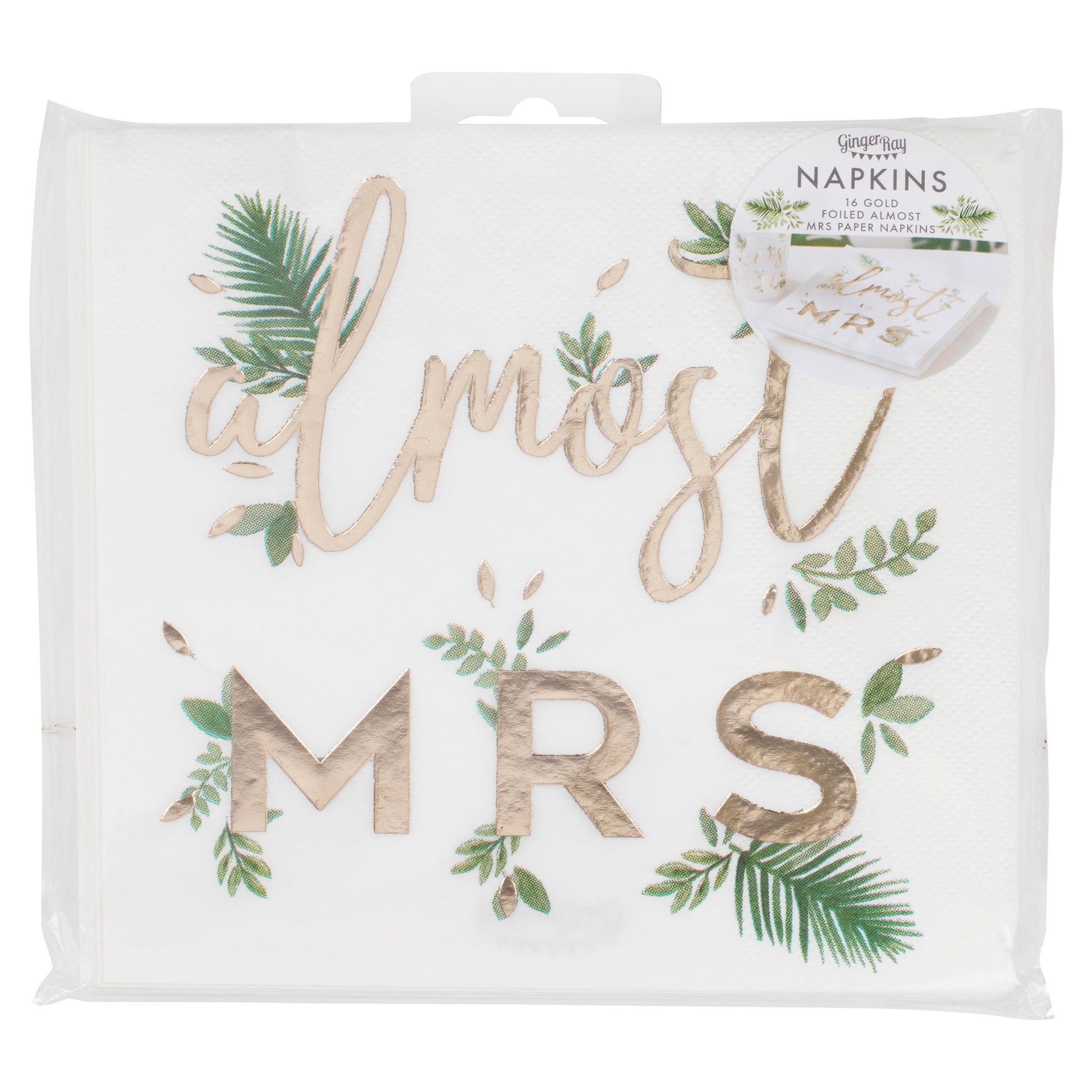 These Almost Mrs white and gold foiled botanical theme napkins are perfect for balancing delicious nibbles in style as you celebrate away. A perfect finishing touch!