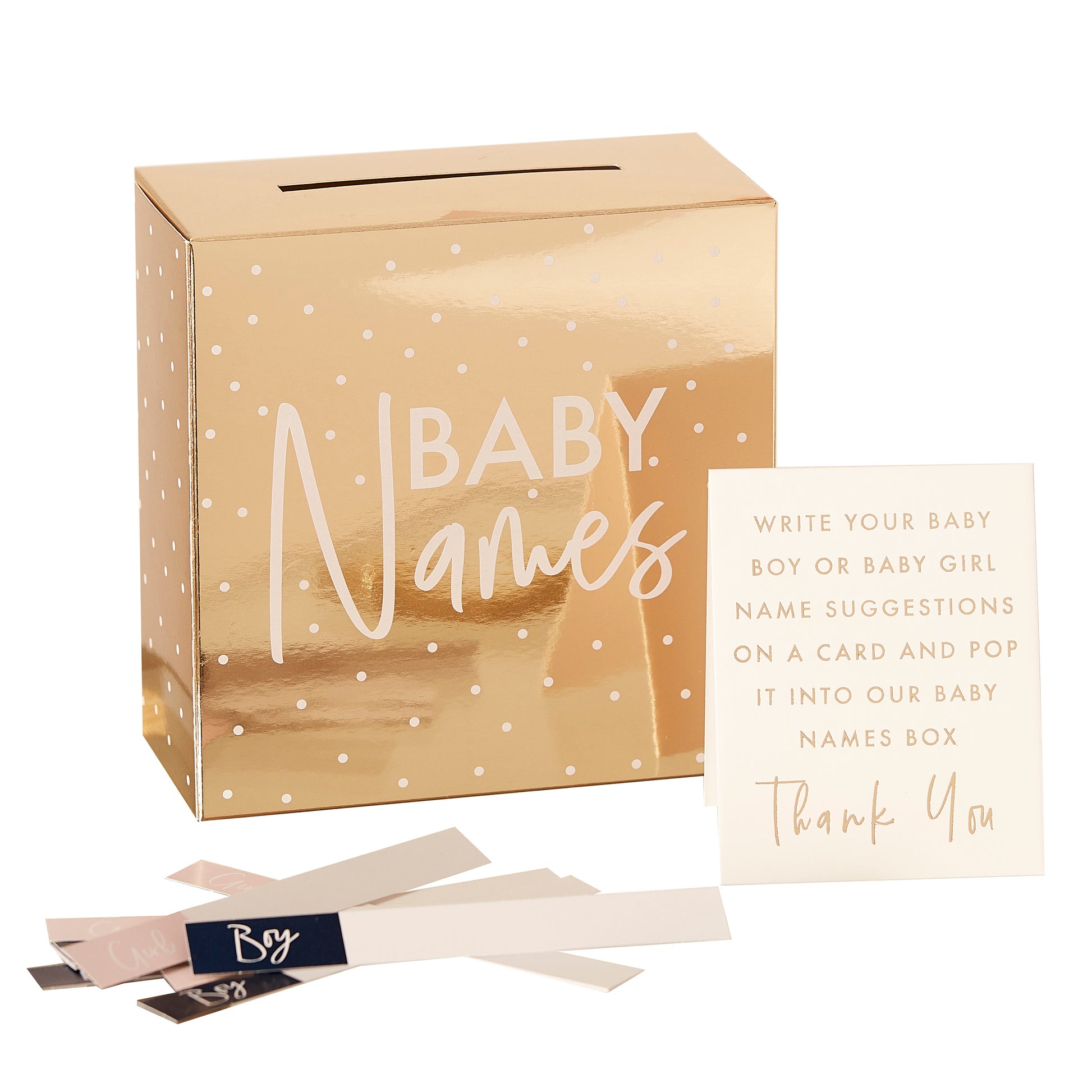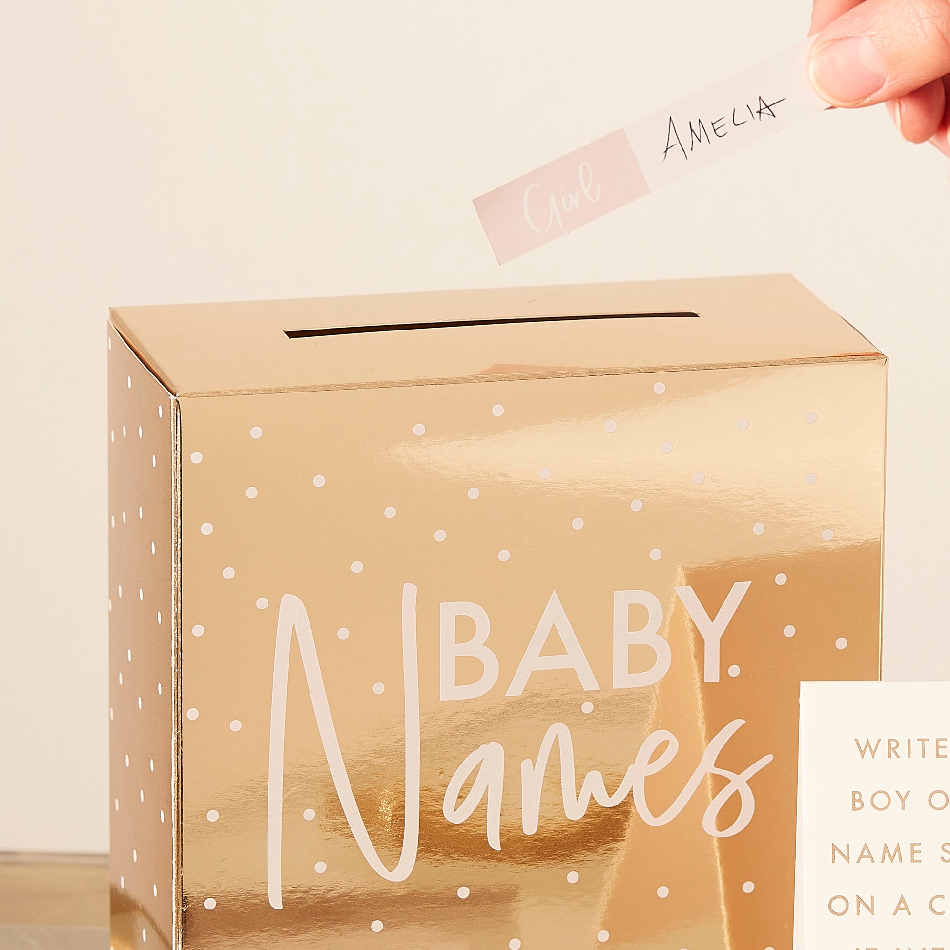 Have fun at your gender reveal party with our baby names suggestion box. Simply ask your guests to write down a baby boy or girl name and pop in the baby names box.