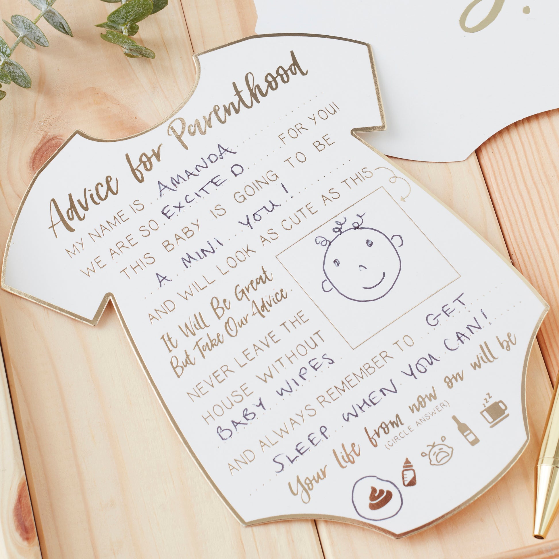 A fun baby shower game these advice cards are beautiful with the gender neutral gold foiling and the baby grow shape.