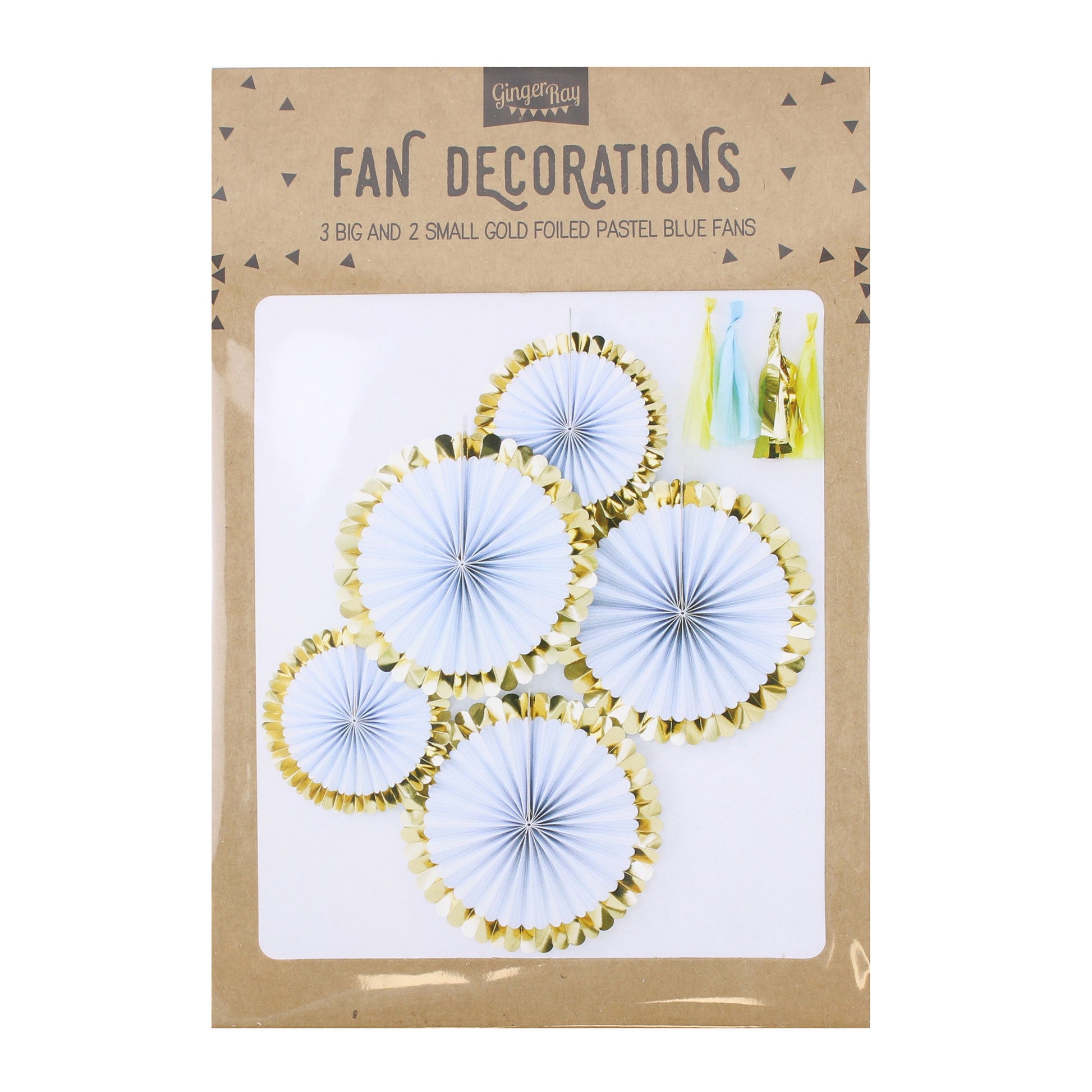 Each pack of hanging decorations contains 5 fans, 3x large and 2x small. Large fans measure: 38cm (D), Small fans measure: 28cm (D). Paper clips are included in the pack to secure fans in place and can be packed away to use again.
