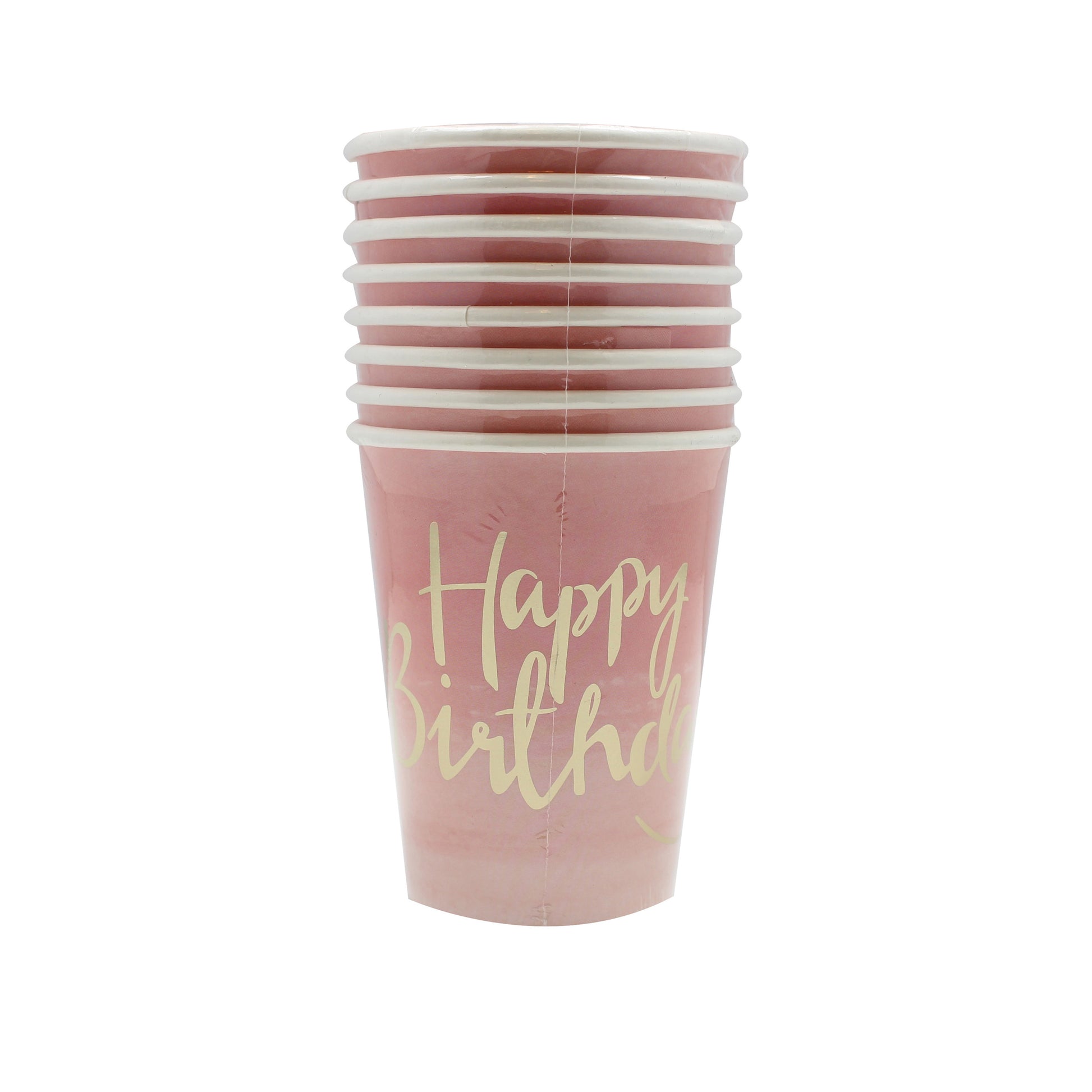 Each cup has a fun pink ombre design with gold foiled "Happy Birthday" perfect for fun birthday celebrations.