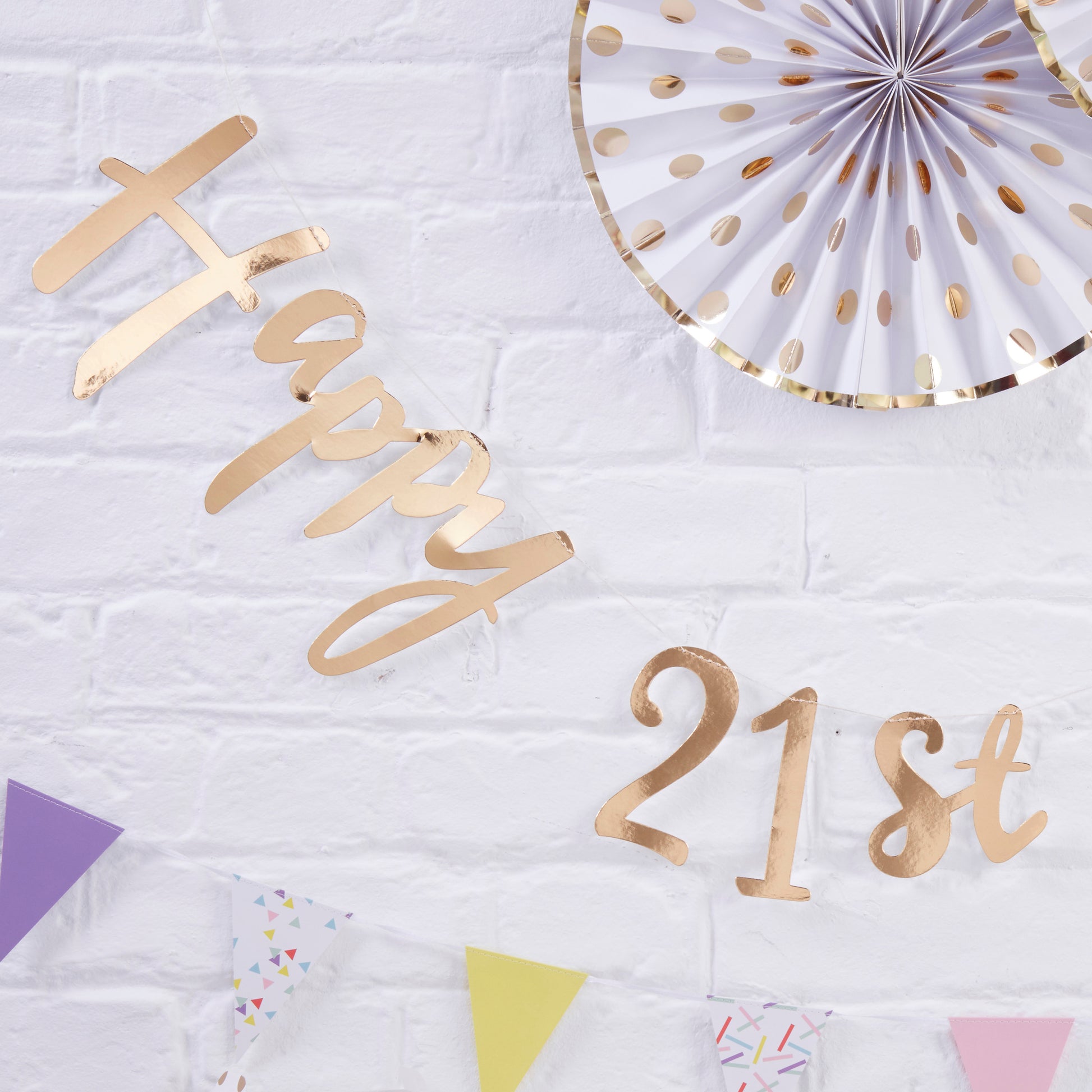 Use this stunning gold foiled Happy 21st Birthday Backdrop at your 21st birthday party. Hang with other buntings within the Pick and Mix range to create a cute 21st party set-up!