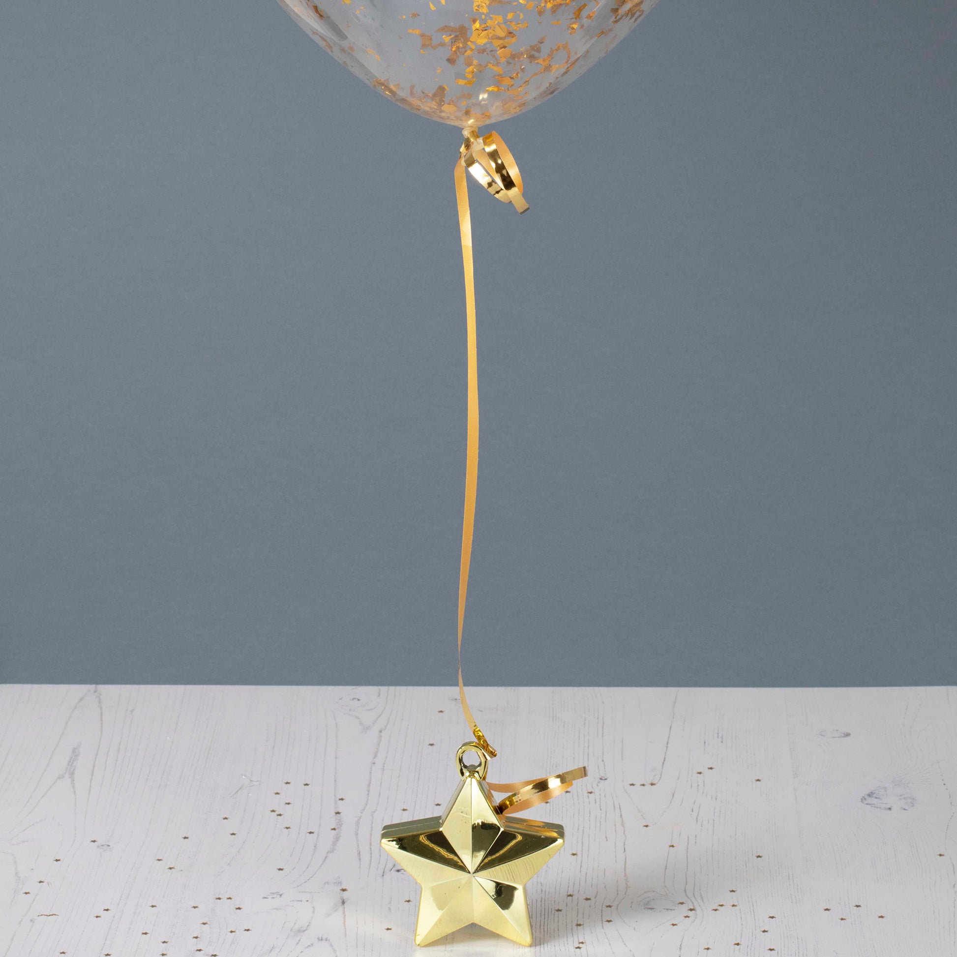 Keep it all together with this simple but effective metallic gold curling ribbon. Attach this ribbon to the tied ends of your balloons and create the perfect party balloon bundle. Attach helium filled balloons to a weight or a secure surface to make sure your balloons don't fly away! You can also use the ribbon to create clusters of air filled balloons and hang them.