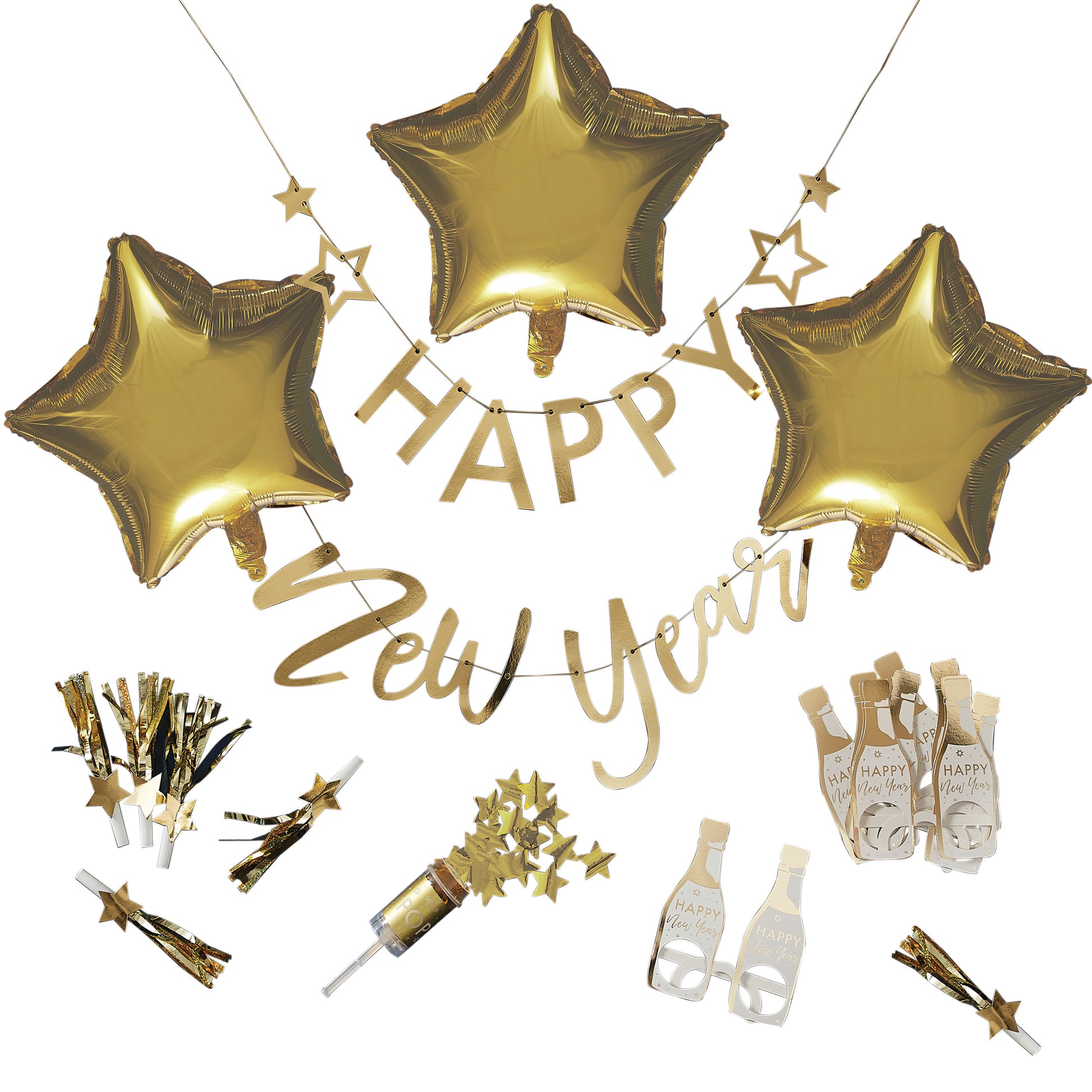 The gold foiled design comes with bunting party blowers fun glasses and balloons. Celebrating could not be easier. Enjoy.