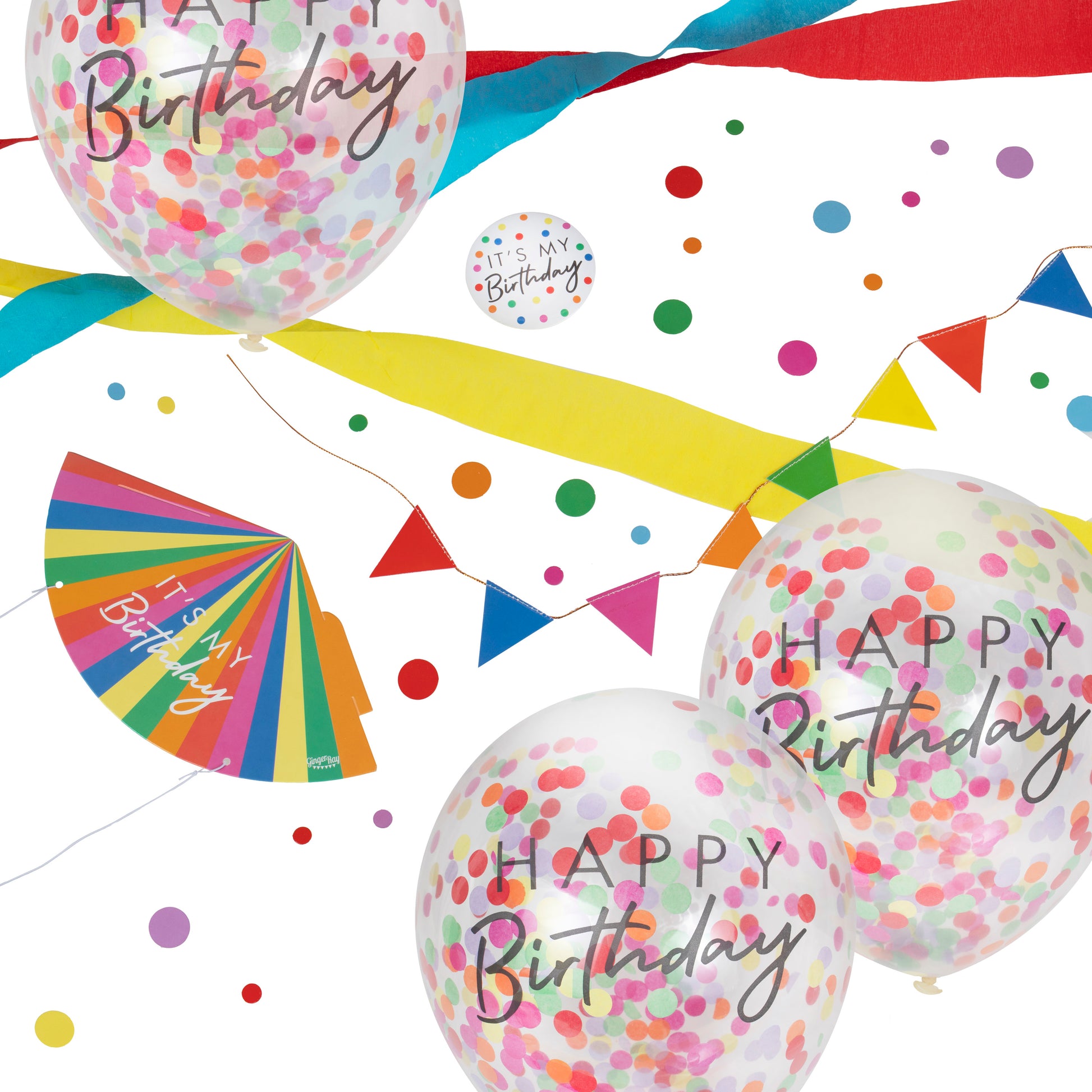 Each pack contains 3 x 12inch Balloons Streamers confetti monitor bunting a party hat and a birthday rosette