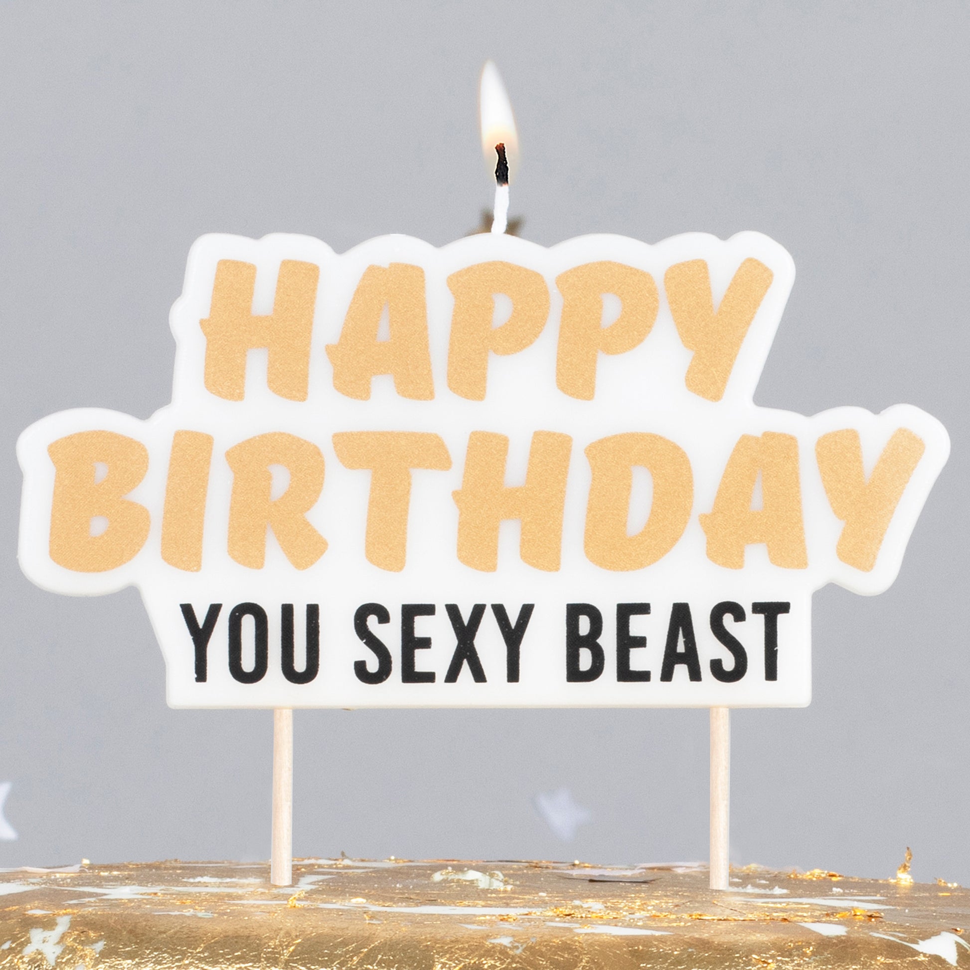 Celebrate their birthday in style this year with this Gold Happy Birthday, You Sexy Beast Candle